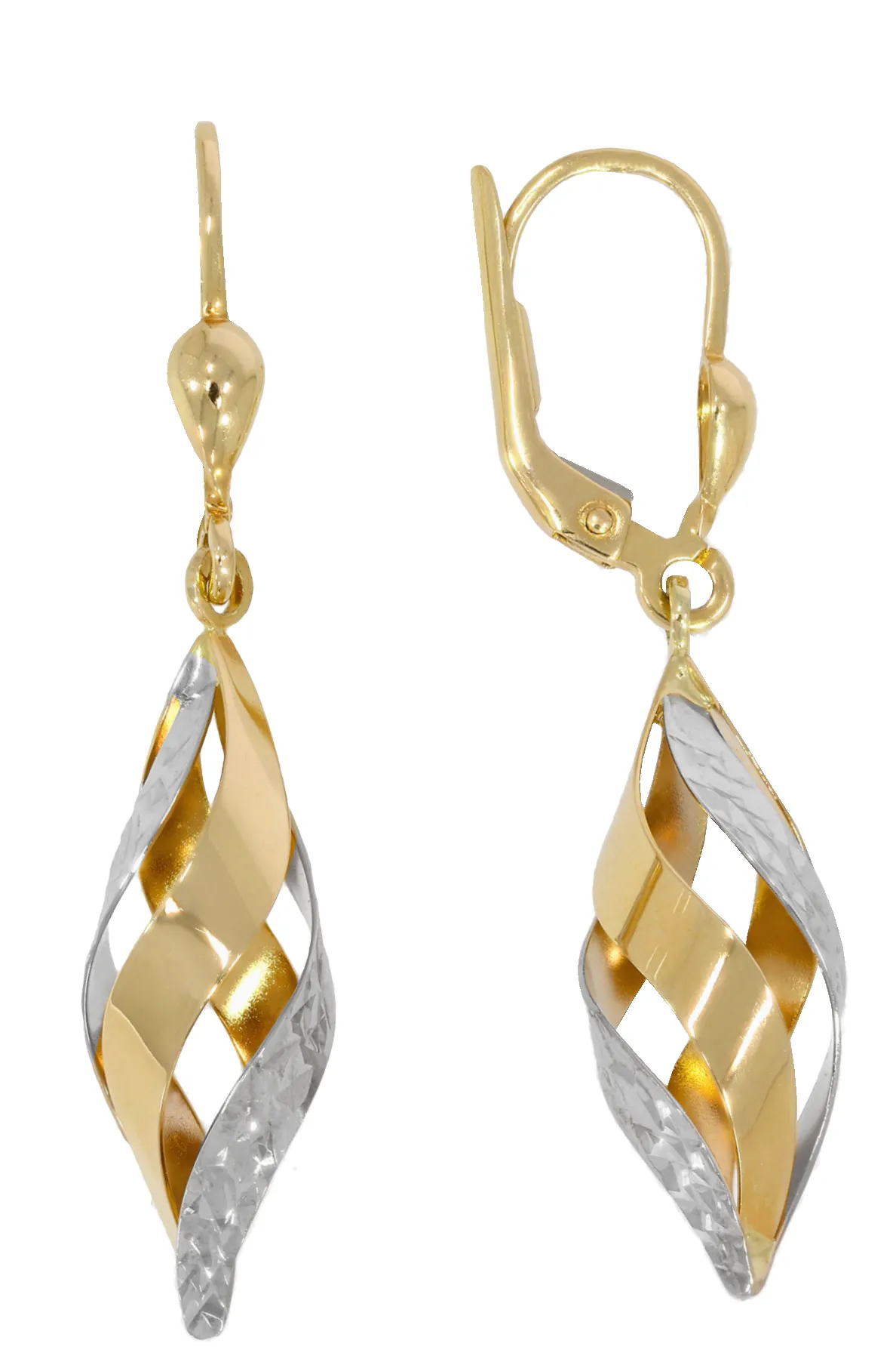 Moderné, veľmi pekné visiace náušnice vyrobené kombináciou žltého a bieleho 14 karátového zlata. Náušnice sa zapínajú na klasický patent, sú vyrobené v točenom motíve, majú lesklý povrch a zdobí ich jemný gravírovaný vzor.