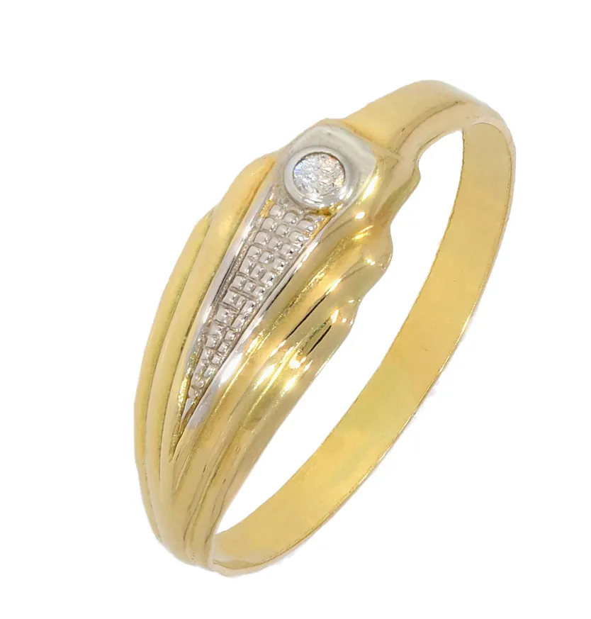 Veľmi pekný dámsky prsteň je vyrobený zo žltého 14 karátového zlata. Prsteň je zdobený jemným vzorom z bieleho zlata a bielim zirkónom, je vhodný tiež ako darček.