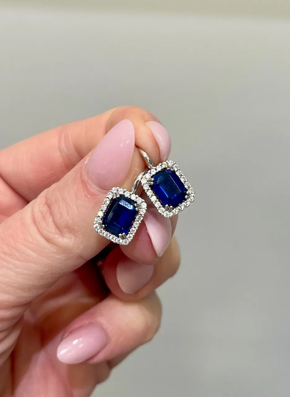 Rozprávkovo krásne náušnice z bieleho zlata zdobené výrazným tmavomodrým kameňom sa zapínajú na klasický patent. Biele trblietavé zirkóny dodávajú šperku krásny lesk.