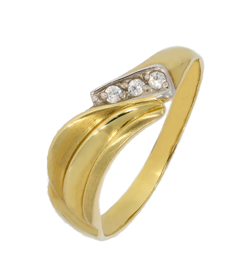 Dámsky zlatý prsteň. Šperk je vyrobený zo žltého 14 karátového zlata a je zdobený bielymi zirkónmi.