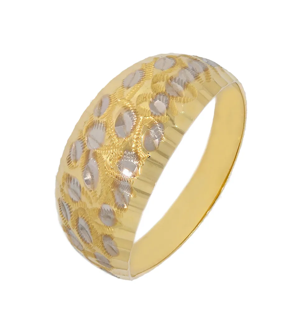 Elegantný dámsky prsteň je vyrobený zo 14 karátového žltého a bieleho zlata. Povrch prsteňa je zdobený lesklým gravírovaným vzorom.