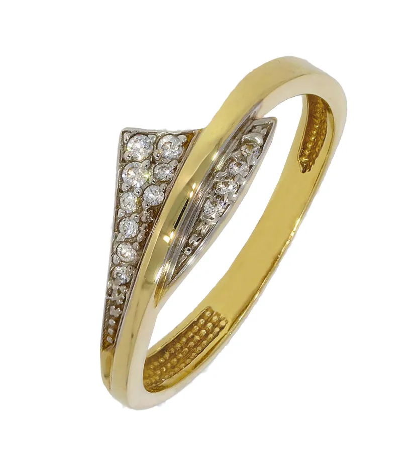 Veľmi pekný, jemný dámsky prsteň vyrobený zo žltého 14 karátového zlata. Šperk zdobia biele zirkóny.