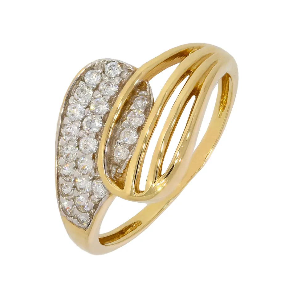Krásny, moderný dámsky prsteň vyrobený zo žltého 14 karátového zlata má lesklý povrch a zdobia ho biele zirkóny.