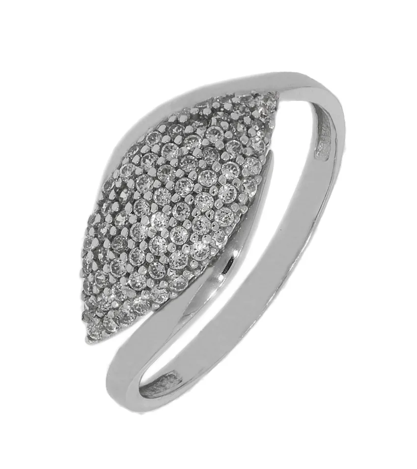 Krásny prsteň z bieleho 14 karátového zlata zdobený bielymi zirkónmi je veľkosti 53. Šperk je široký 9mm a váži 1,95 gramov.