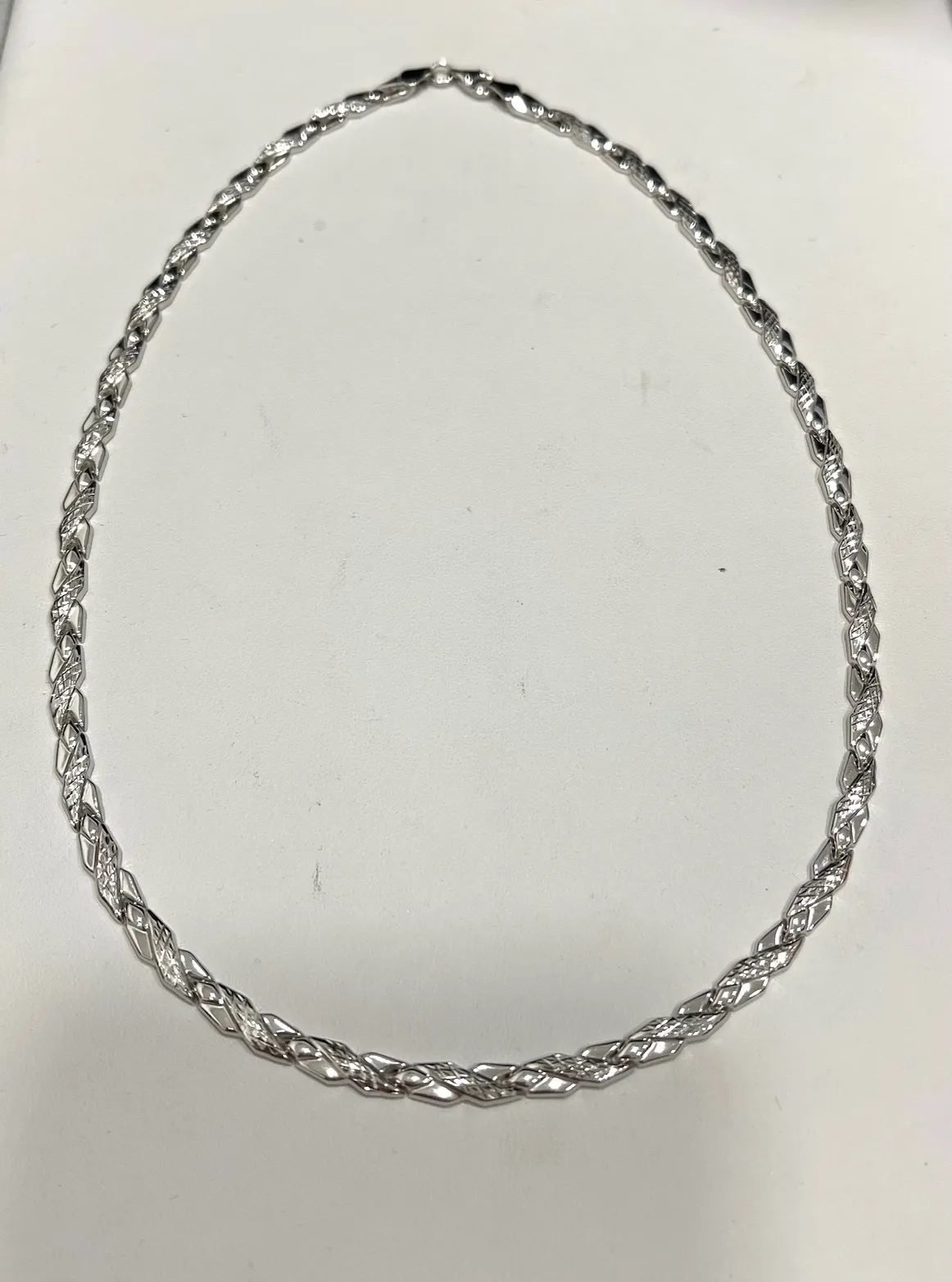 Krásny náhrdelník z bieleho zlata dokonale doplní Váš každodenný elegantný outfit. Tvorený je z lesklých podlhovastých očiek, ktoré zdobí jemný gravírovaný vzor. Použité zapínanie má tvar bezpečnej karabínky.