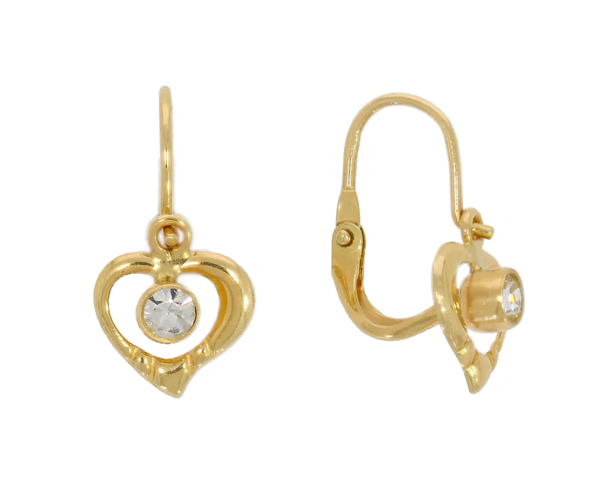 Nežné náušnice zo žltého 14 karátového zlata zhotovené v tvare srdiečka zdobí okrúhly biely zirkón. Náušnice sú vďaka bezpečnému zapínaniu spredu vhodné pre dievčatká už od narodenia. Vhodné sú tiež ako darček napríklad na krstiny.