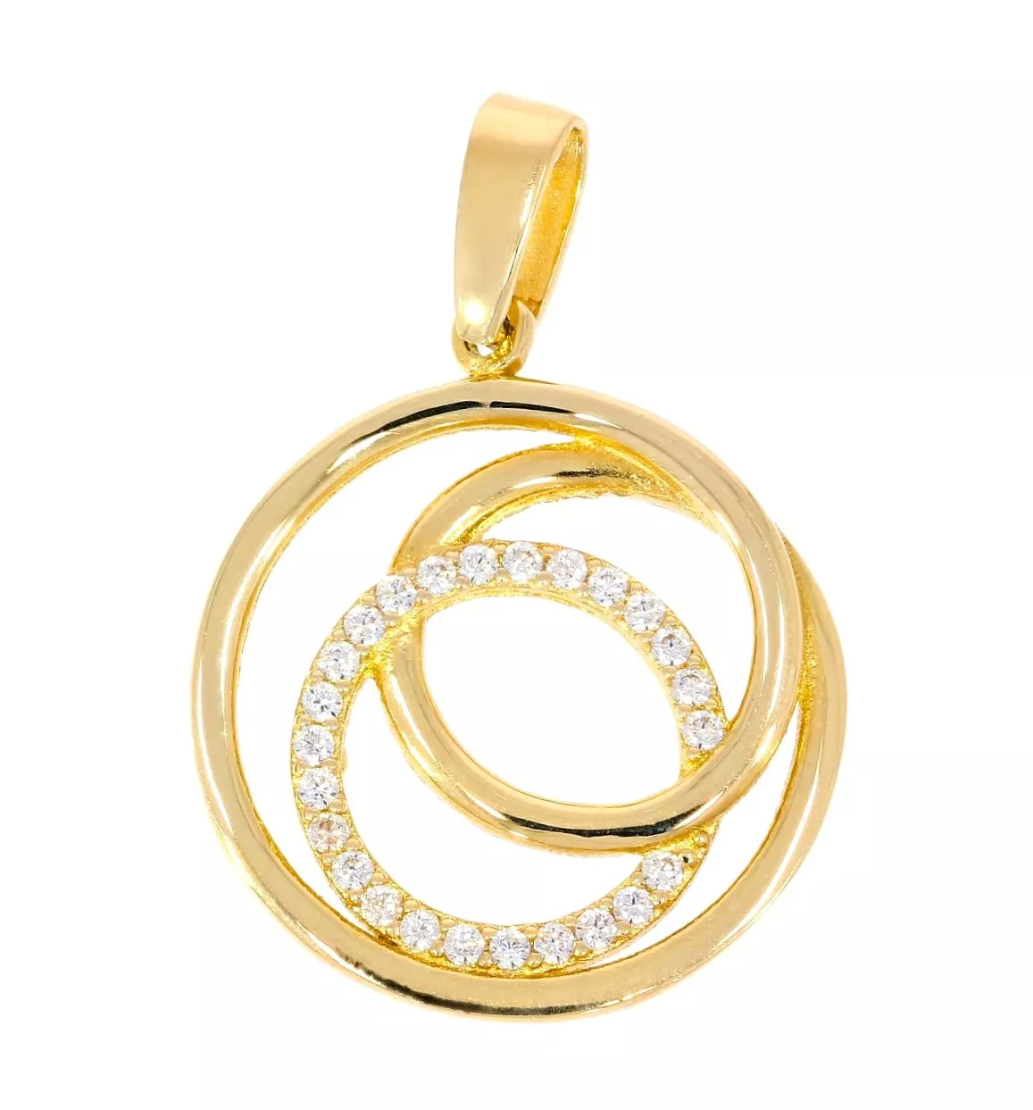 Oživte svoju zlatú retiazku zlatým prívesok s moderným dizajnom. Tri navzájom prepletené pevné kruhy zdobia biele zirkóny.