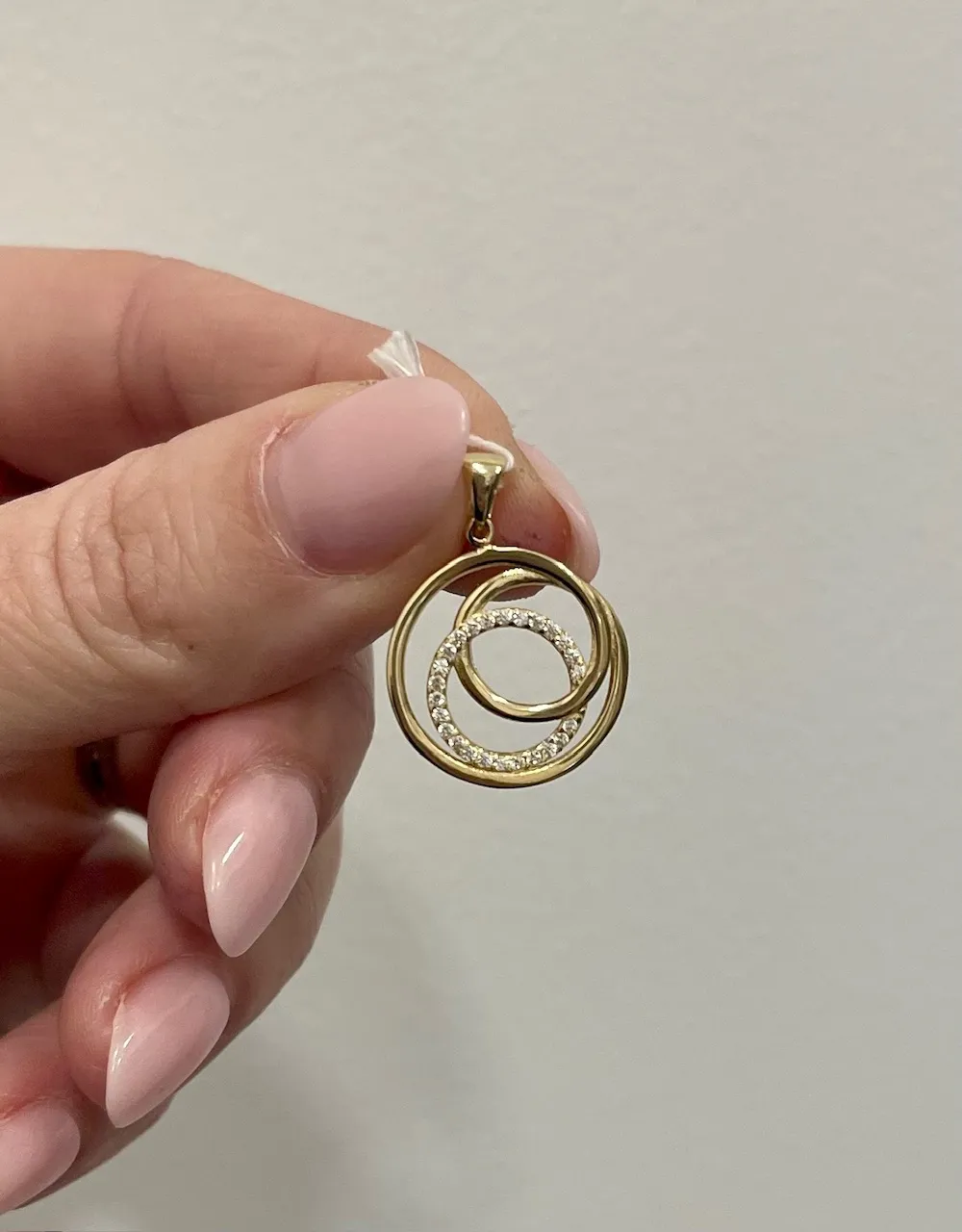 Moderný zlatý prívesok zdobený množstvom zirkónov.