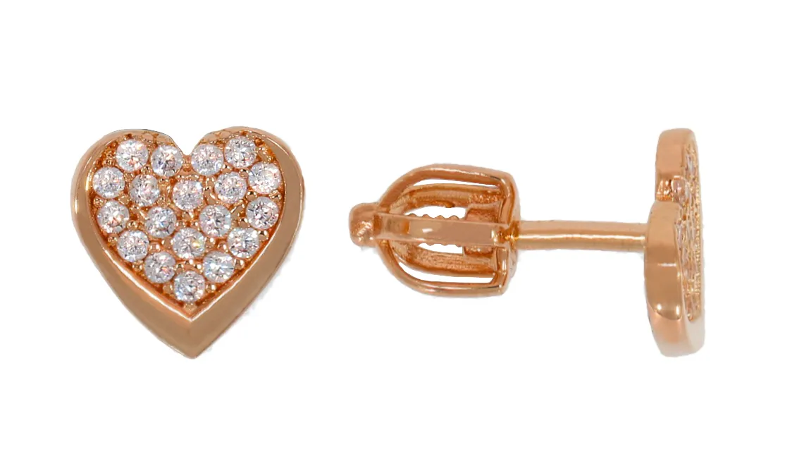 Moderné zlaté náušnice z ružového zlata v tvare srdiečka sú zdobené množstvom malých zirkónov. Šrobovacie balóniky zabezpečia komfort nosenia náušníc aj pri spaní.
