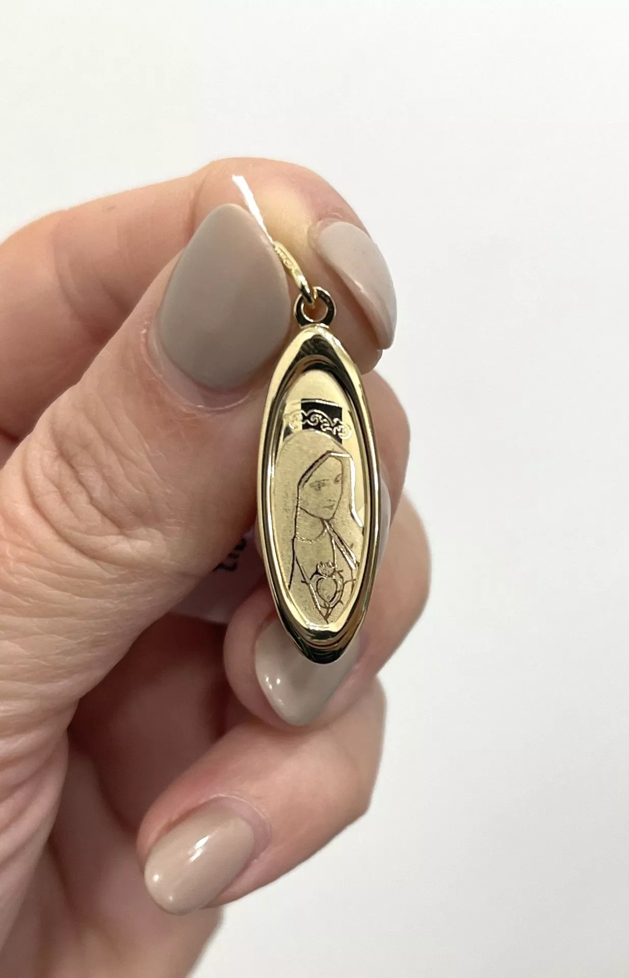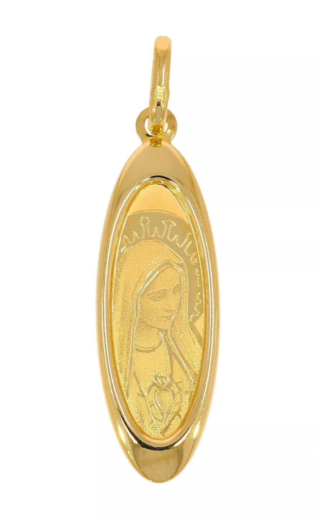Oválny zlatý prívesok s náboženským motívom má hladký, lesklý lem.