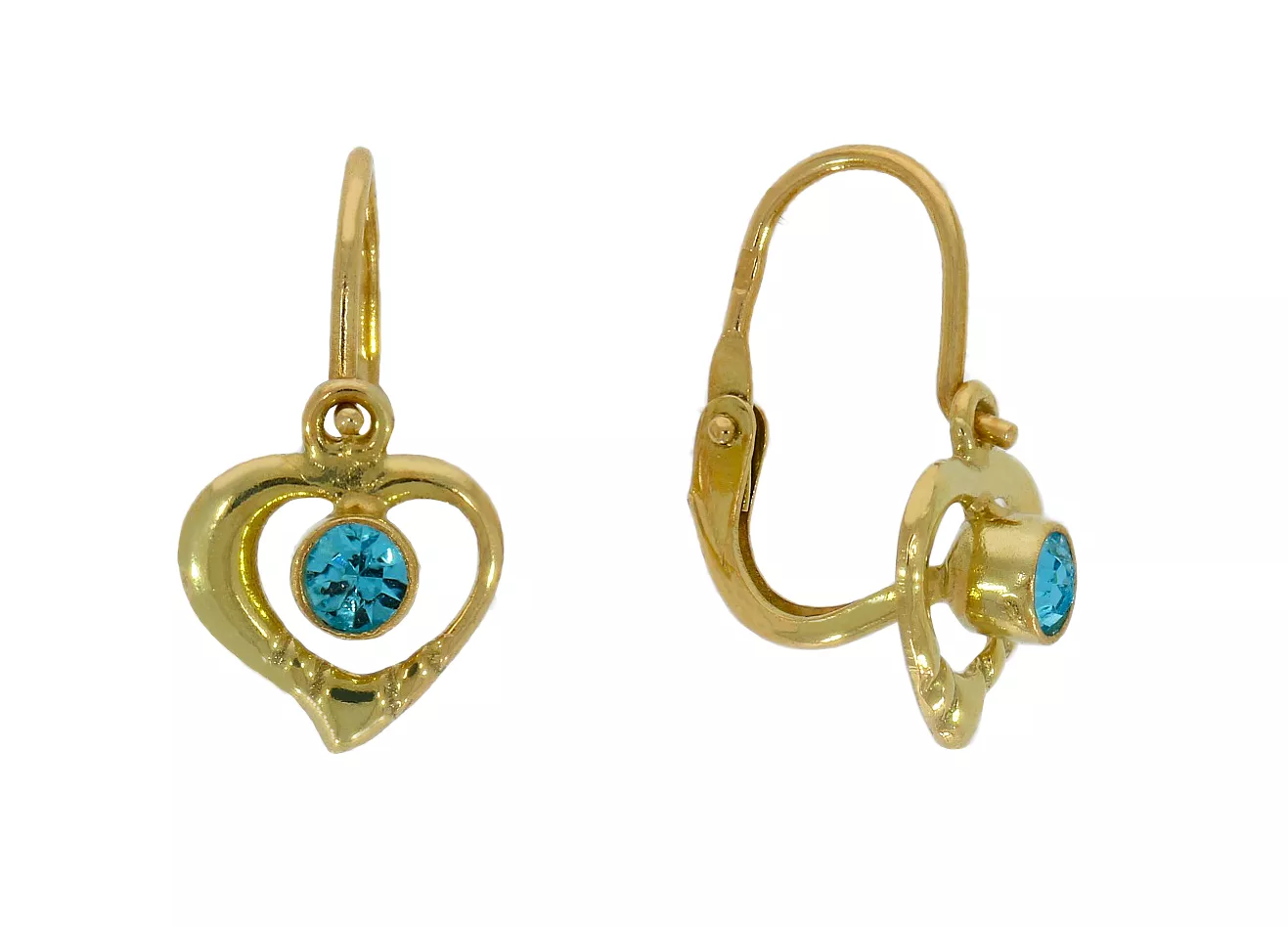 Darujte na krstiny, či prvé narodeniny krásne detské zlaté náušnice, ktoré sú vhodné pre dievčatká už od narodenia. Vyrobené sú zo žltého zlata v tvare srdca, ktoré zdobí modrý zirkón.