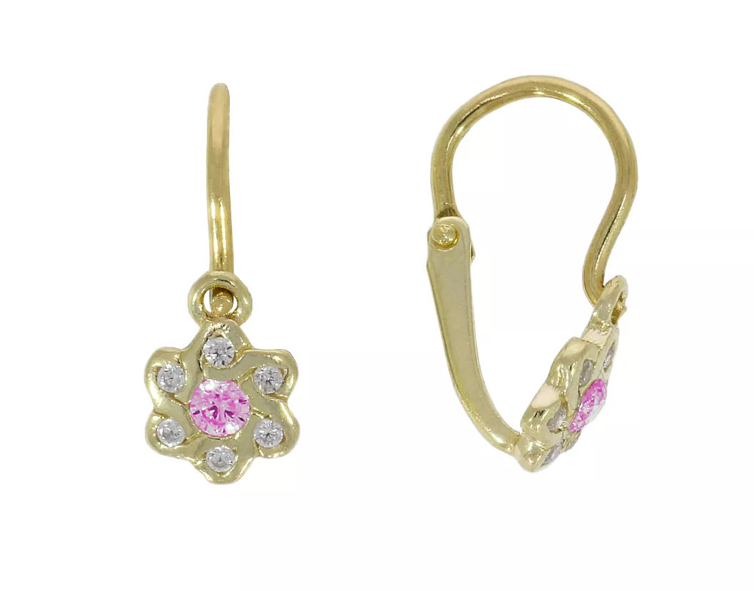 Milé detské zlaté náušnice vyrobené v tvare kvetiny sú vďaka bezpečnému zapínaniu spredu vhodné pre dievčatká už od narodenia. Náušnice zdobia ružové a biele zirkóny a sú vhodné aj ako darček na narodeniny či krstiny.