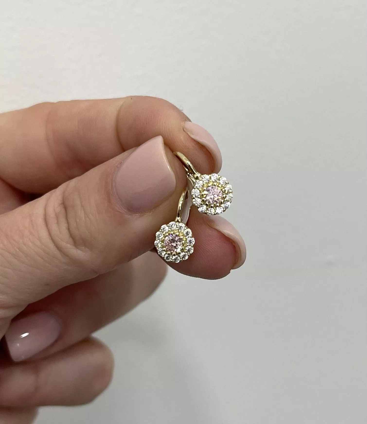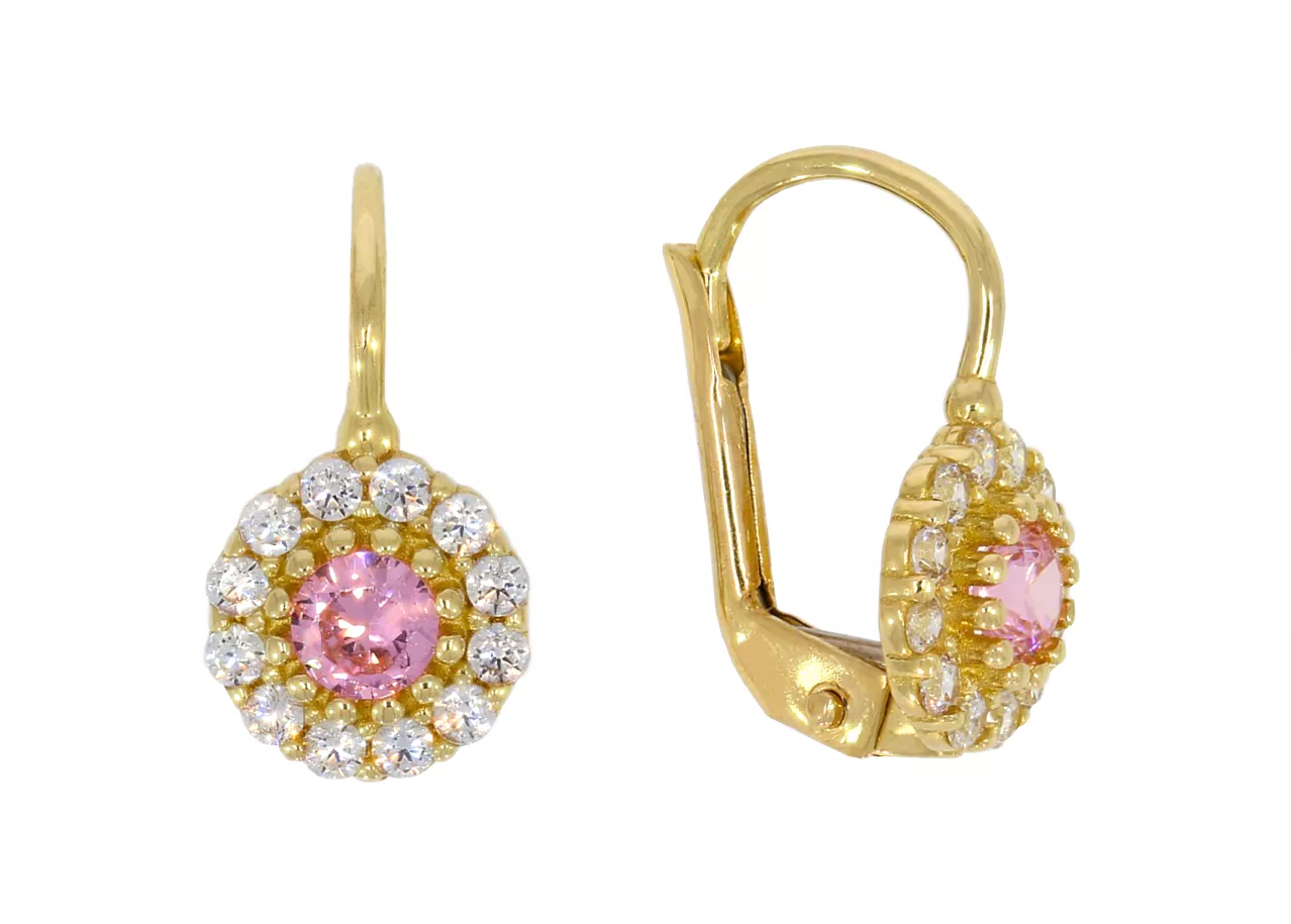Roztomilé zlaté náušnice vyrobené zo žltého 14k zlata zdobené bielymi a ružovými zirkónmi. Náušnice sú ideálnou voľbou aj pre dievčatká.