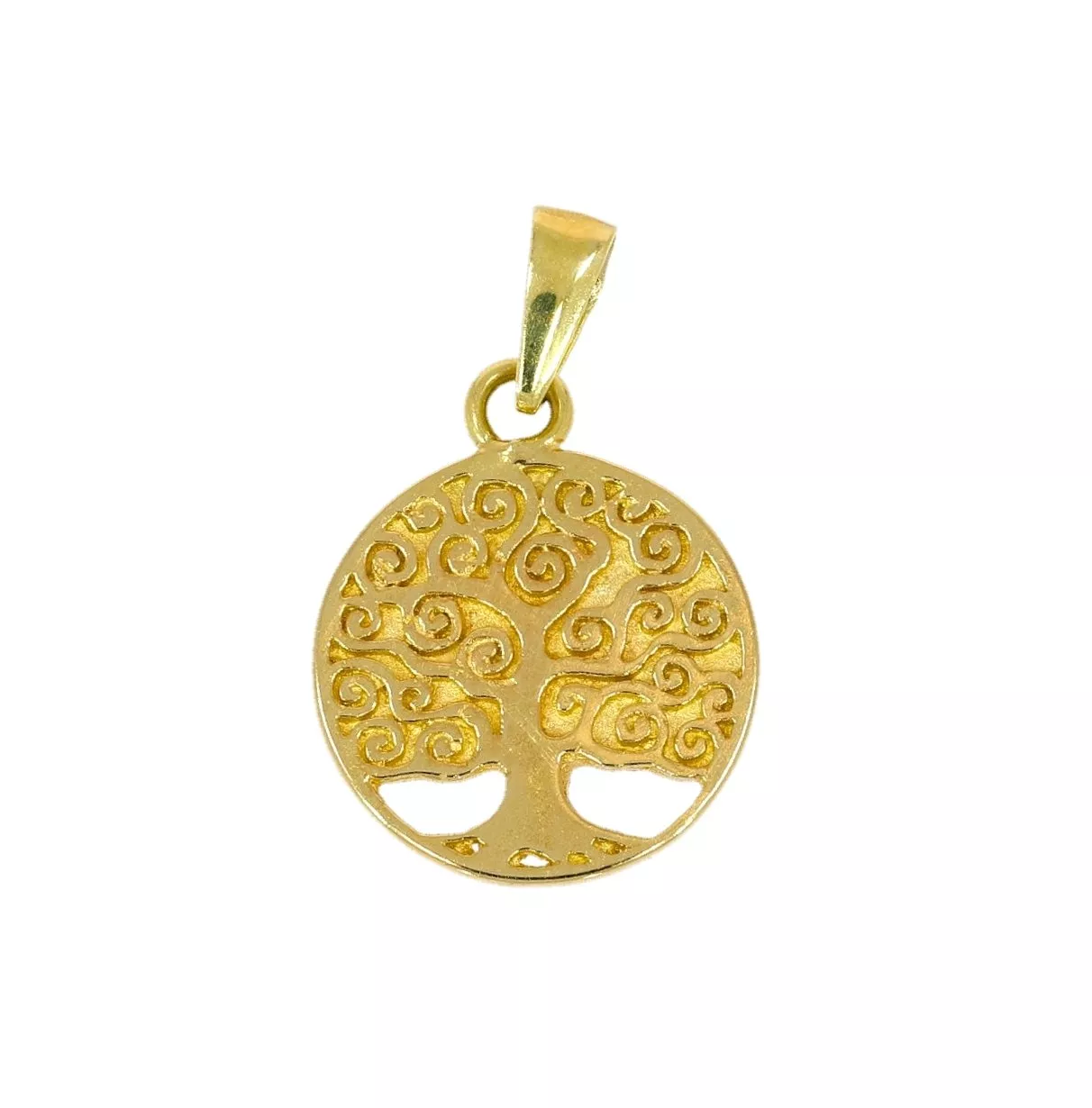Moderný okrúhly prívesok zo žltého zlata so stromom života.