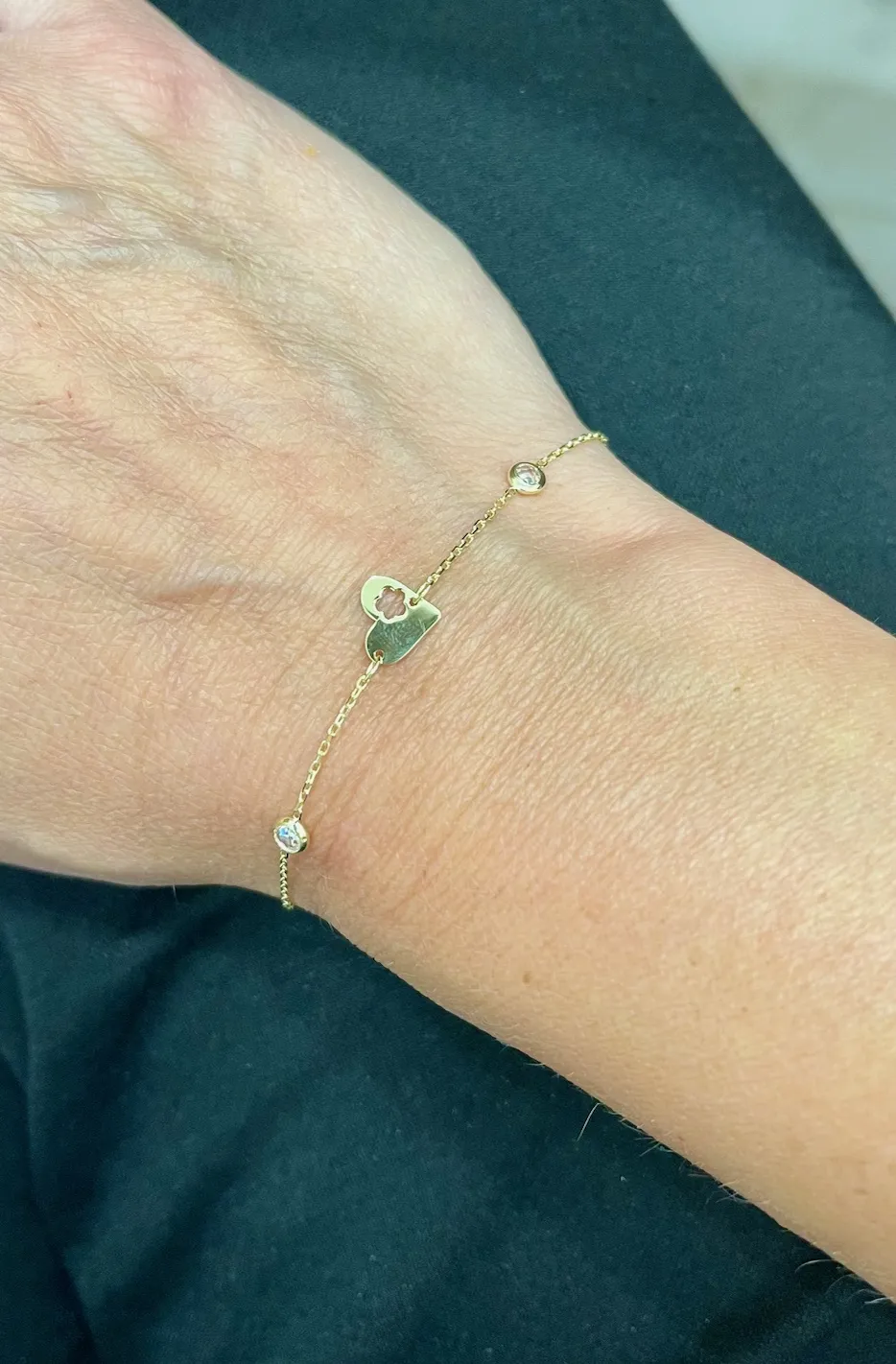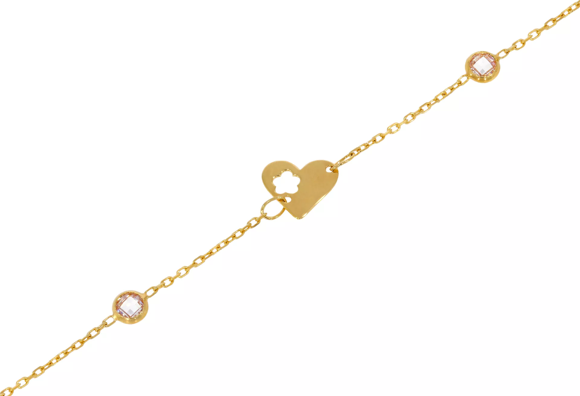 Skutočne veľmi pekný, nežný zlatý náramok zdobený srdiečkom a dvomi okrúhlymi zirkónmi. Náramok má regulovateľnú dĺžku od 17cm do 20cm a zapínanie v tvare pérového krúžku. Spolu so Zlatou retiazkou 1106 tvoria krásnu súpravu.