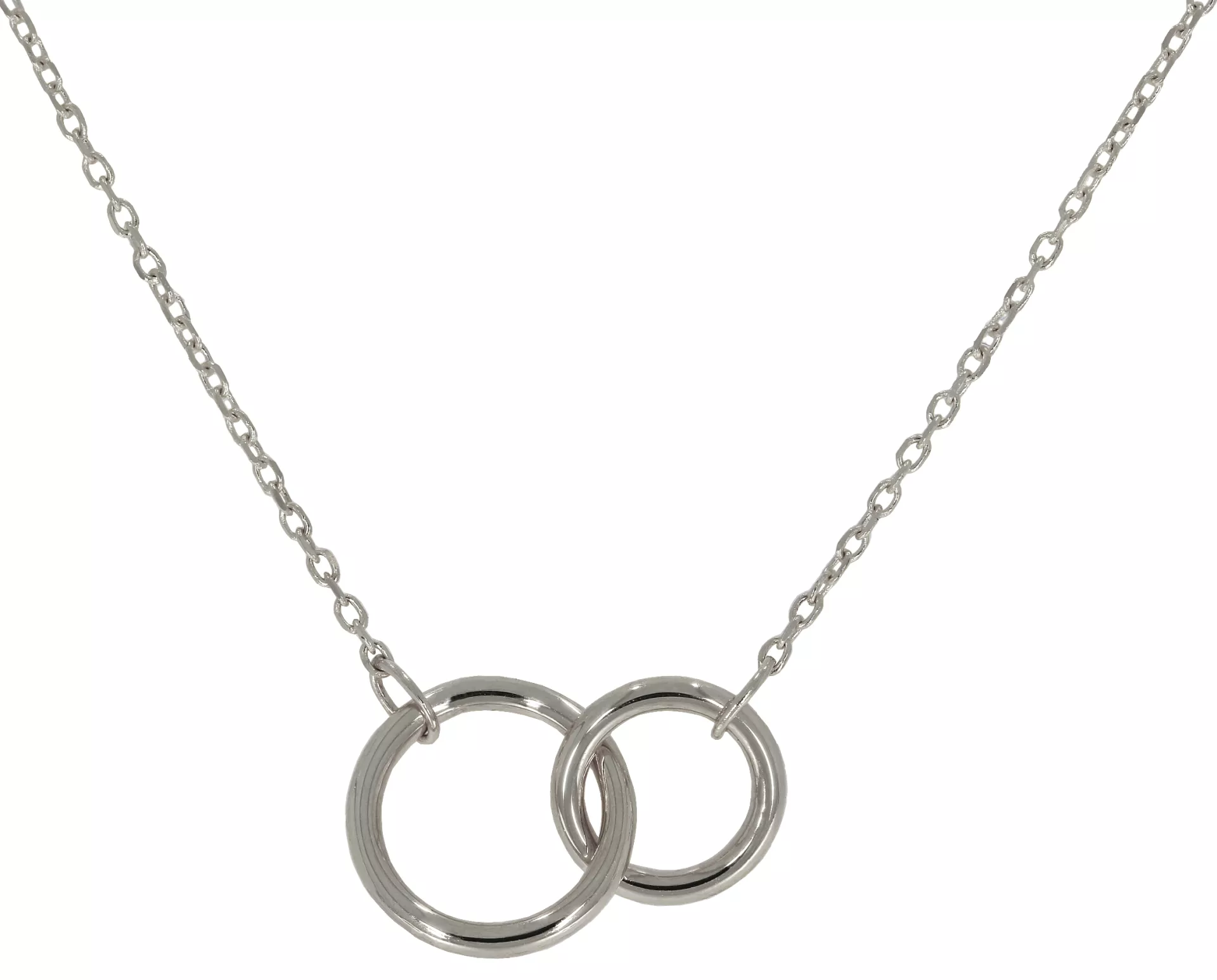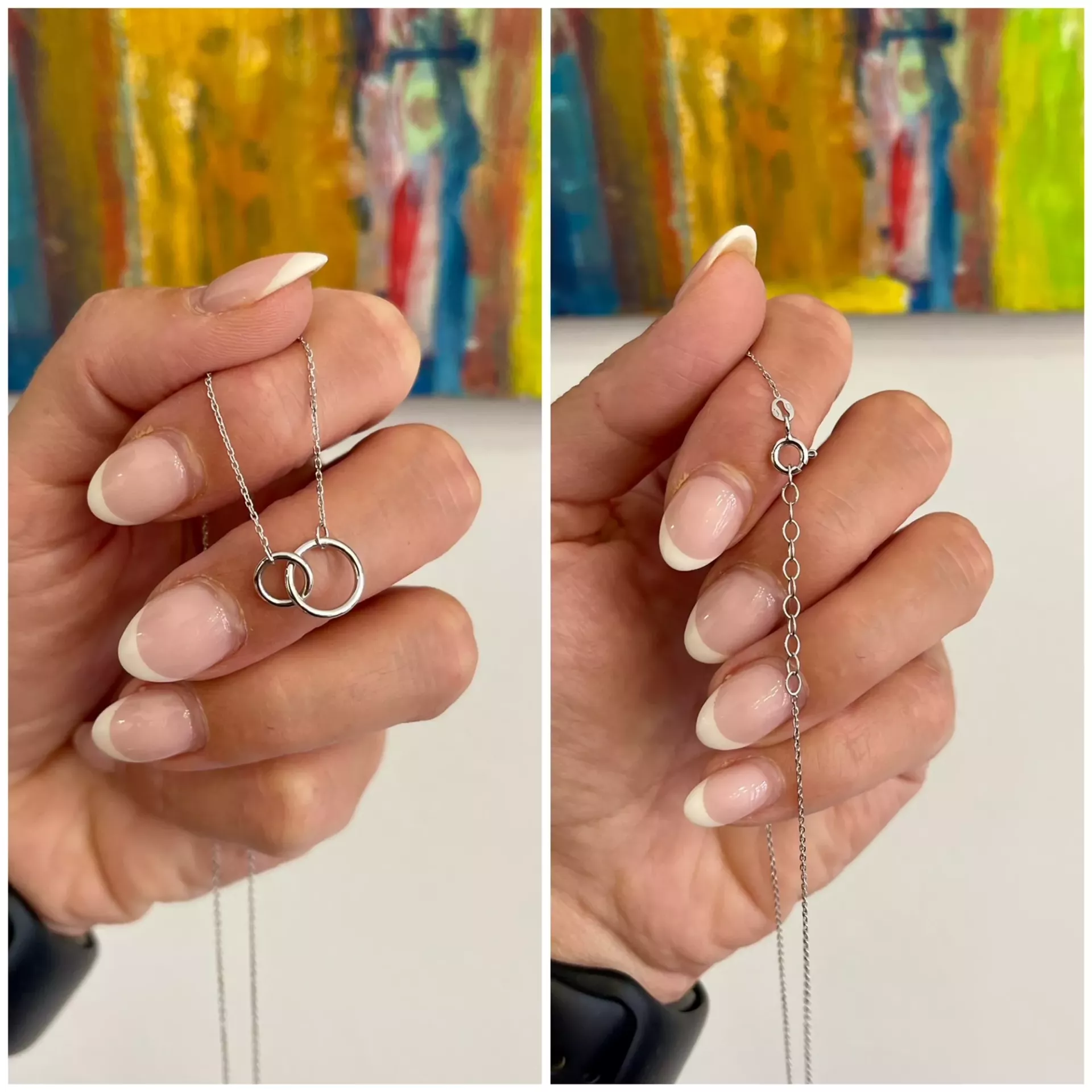 Moderná retiazka z bieleho 14 karátového zlata zdobená vzájomne prepletenými kruhmi s priemerom 12mm a 9mm. Retiazka má regulovateľnú dĺžku v rozmedzí 3cm. Zapínanie má tvar pérového krúžku.
