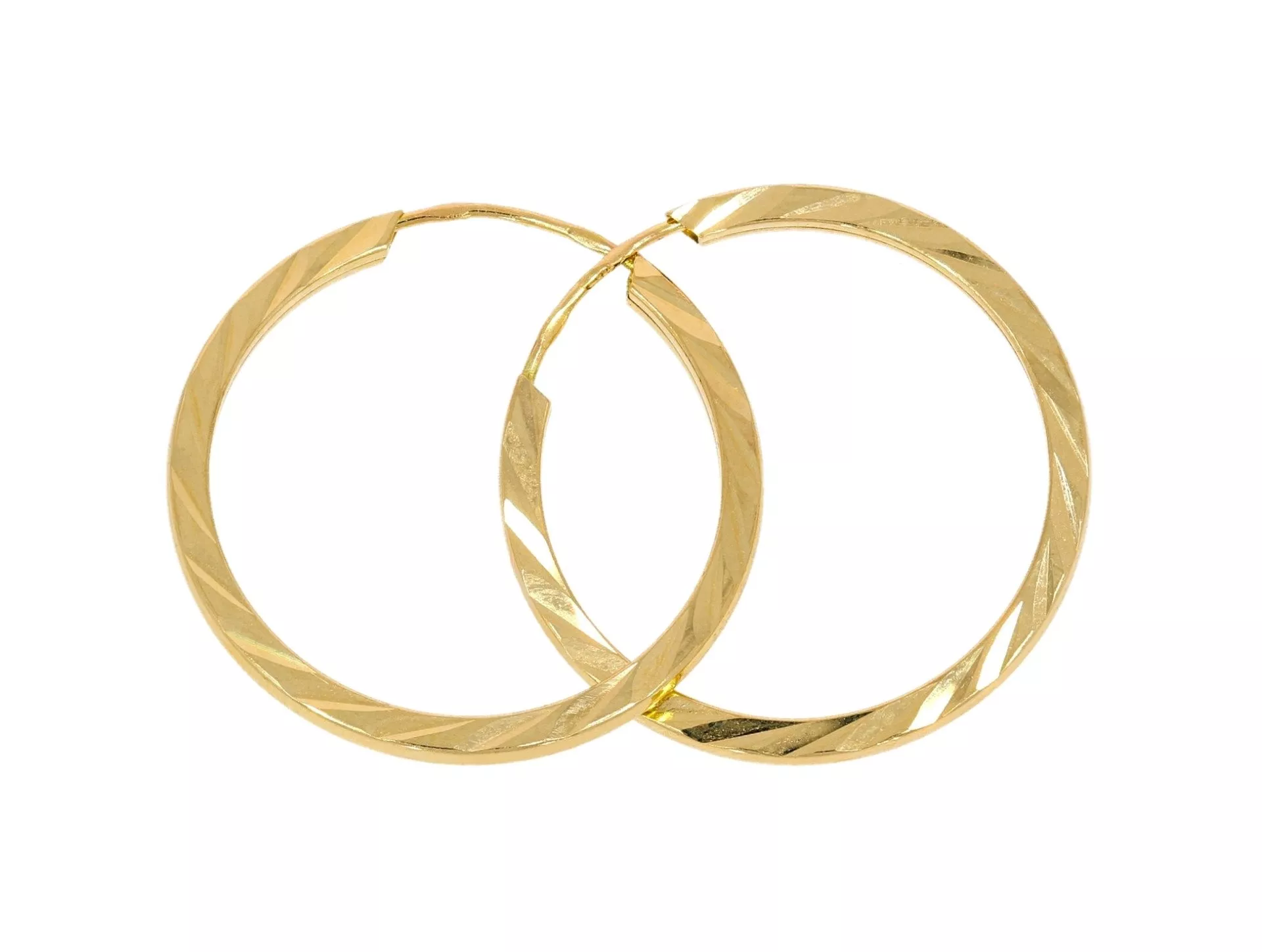 Pekné zlaté náušnice vyrobené zo žltého 14 karátového zlata s lesklou povrchovou úpravou. Šperk zdobí jemný gravírovaný vzor, ktorý dotvára celkový dizajn šperku.