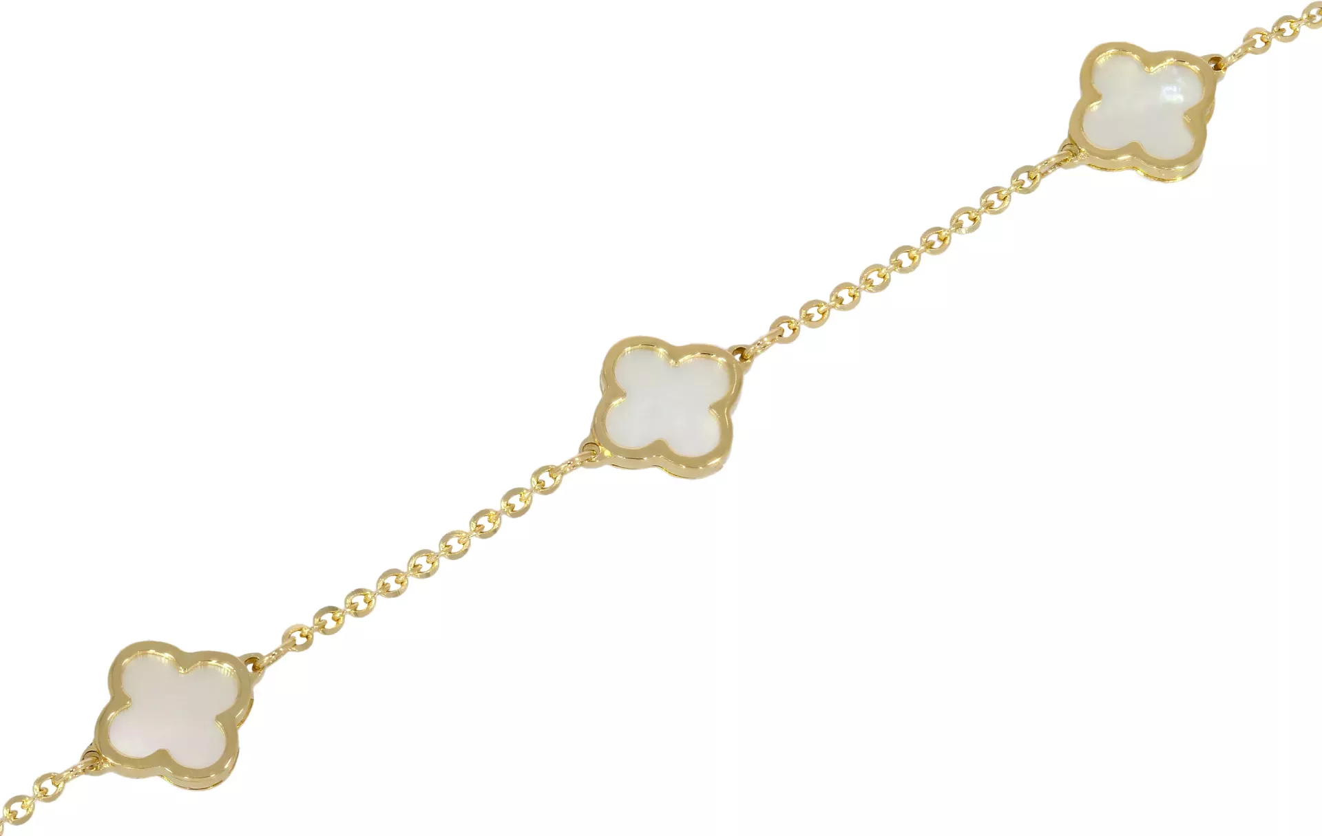 Moderný dámsky zlatý náramok s tromi perleťovými štvoslítkami so šírkou 8mm a s nastaviteľnou dĺžkou v rozmedzí 1 cm. Zapínanie náramku má tvar karabínky. Tento krásny šperk je vhodné kombinovať tiež s príveskom, retiazkou alebo náušnicami s podobným motívom.