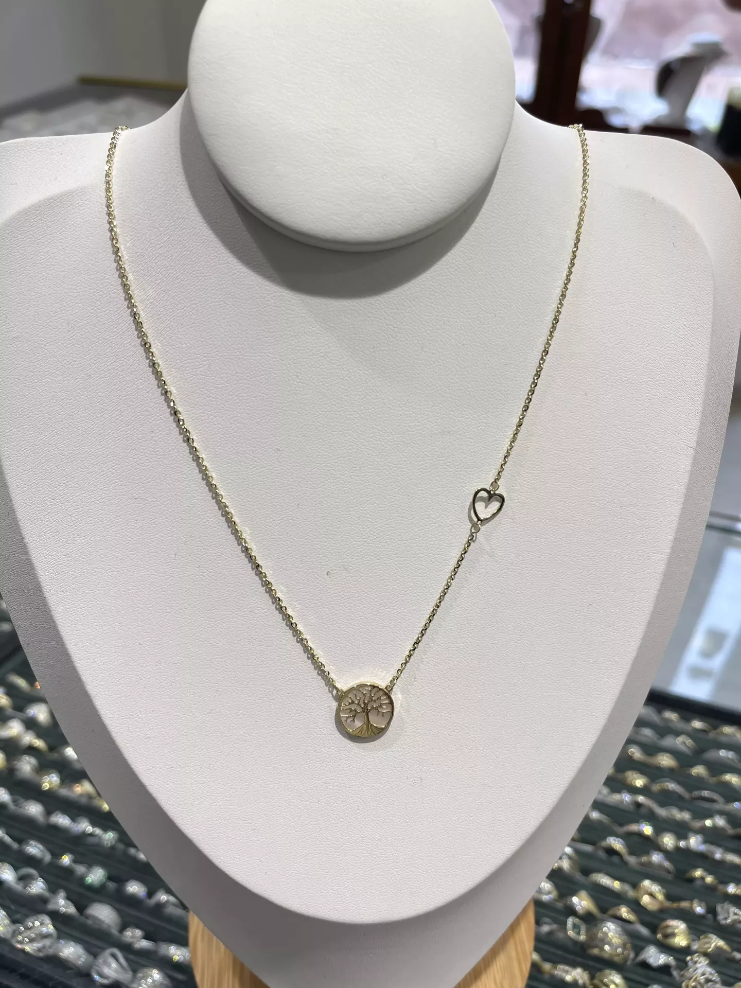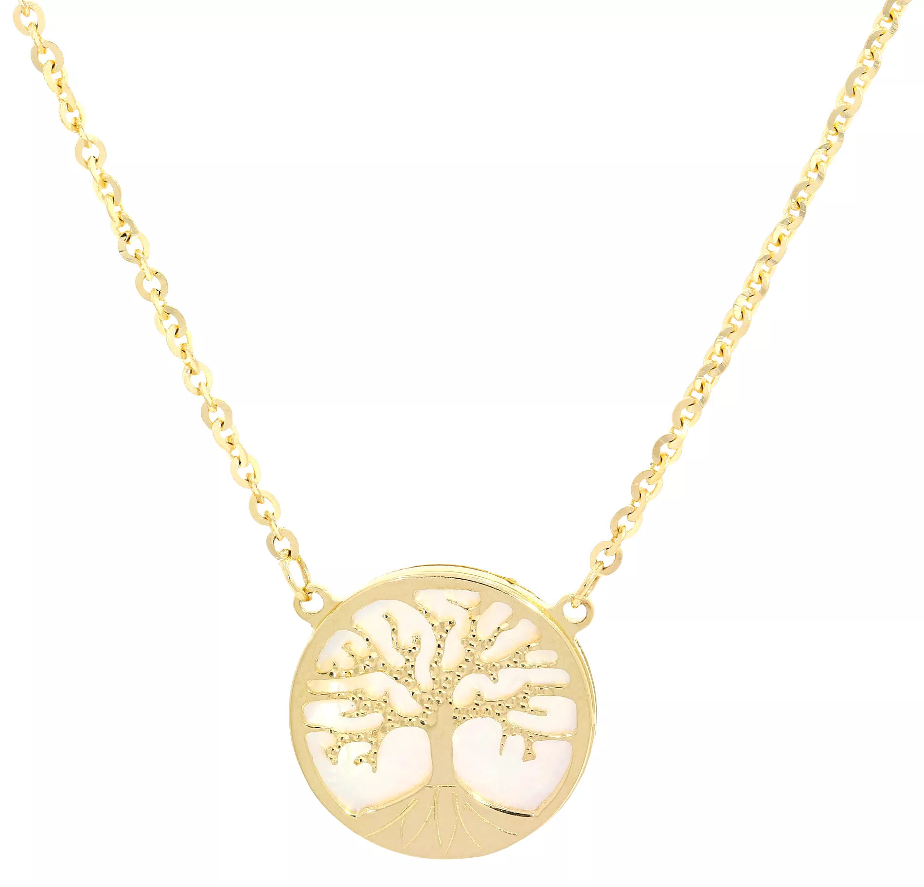 Okrúhly strom života spojený s perleťou a vyrezané srdiečko zdobia zlatú retiazku s regulovateľnou dĺžkou 45cm alebo 42cm. Strom života má priemer 13mm, srdiečko je široké 8mm. Použité zapínanie retiazky má tvar karabínky.
