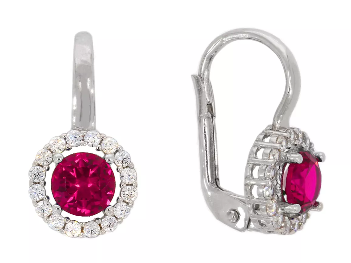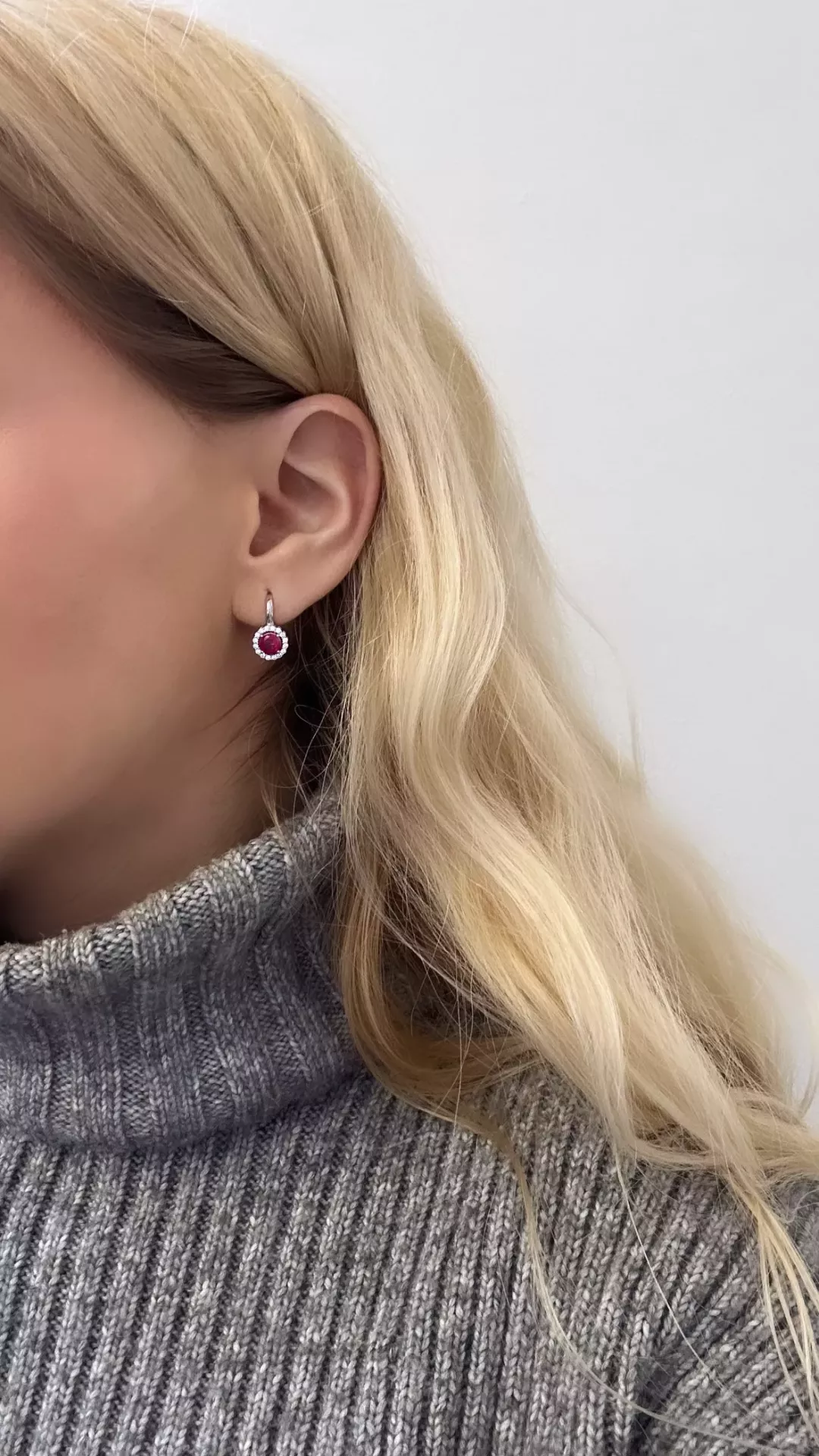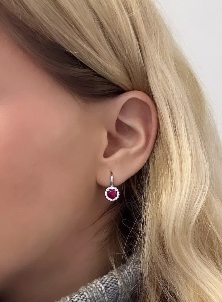 Náušnice z bieleho zlata zdobí tmavoružový kameň, ktorého jas zvýrazňujú biele zirkóny umiestneného okolo neho.