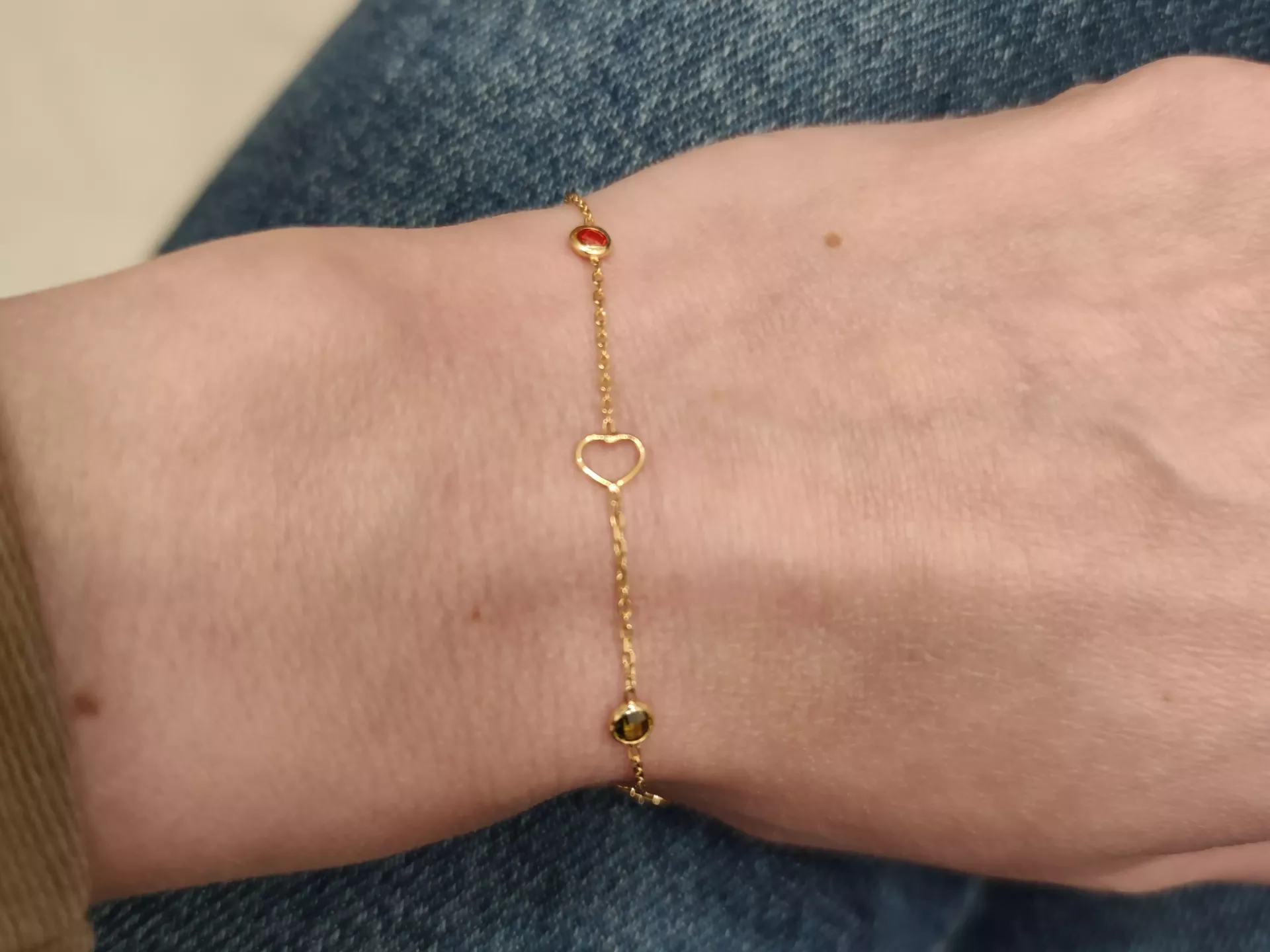 Elegantný zlatý náramok zdobia 3 zlaté srdiečka a 3 farebné kamienky. Zlatý náramok je nastaviteľný v rozmedzí od 17 cm do 20 cm.