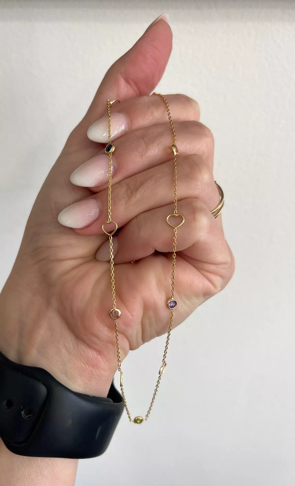 Oživte svoj outfit o zlatú retiazku, ktorú zdobí šesť srdiečok širokých 6mm a sedem farebných zirkónov s priemerom 4mm. Tie sa v retiazke striedajú po celom obvode. Dĺžka šperku je regulovateľná od 42cm do 45cm. Zapínanie má tvar pérového krúžku.