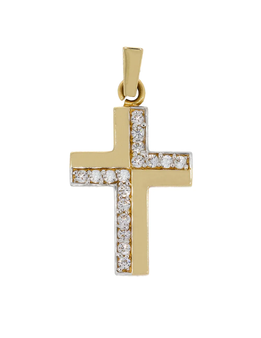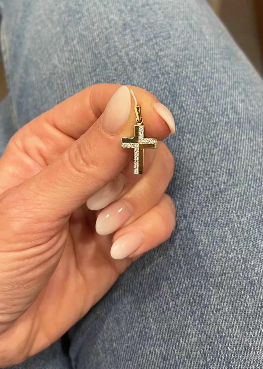 Zlatý prívesok 459 195 € Elegantný zlatý prívesok v tvare kríža zdobený bielym tónovaním zlata. Do košíka