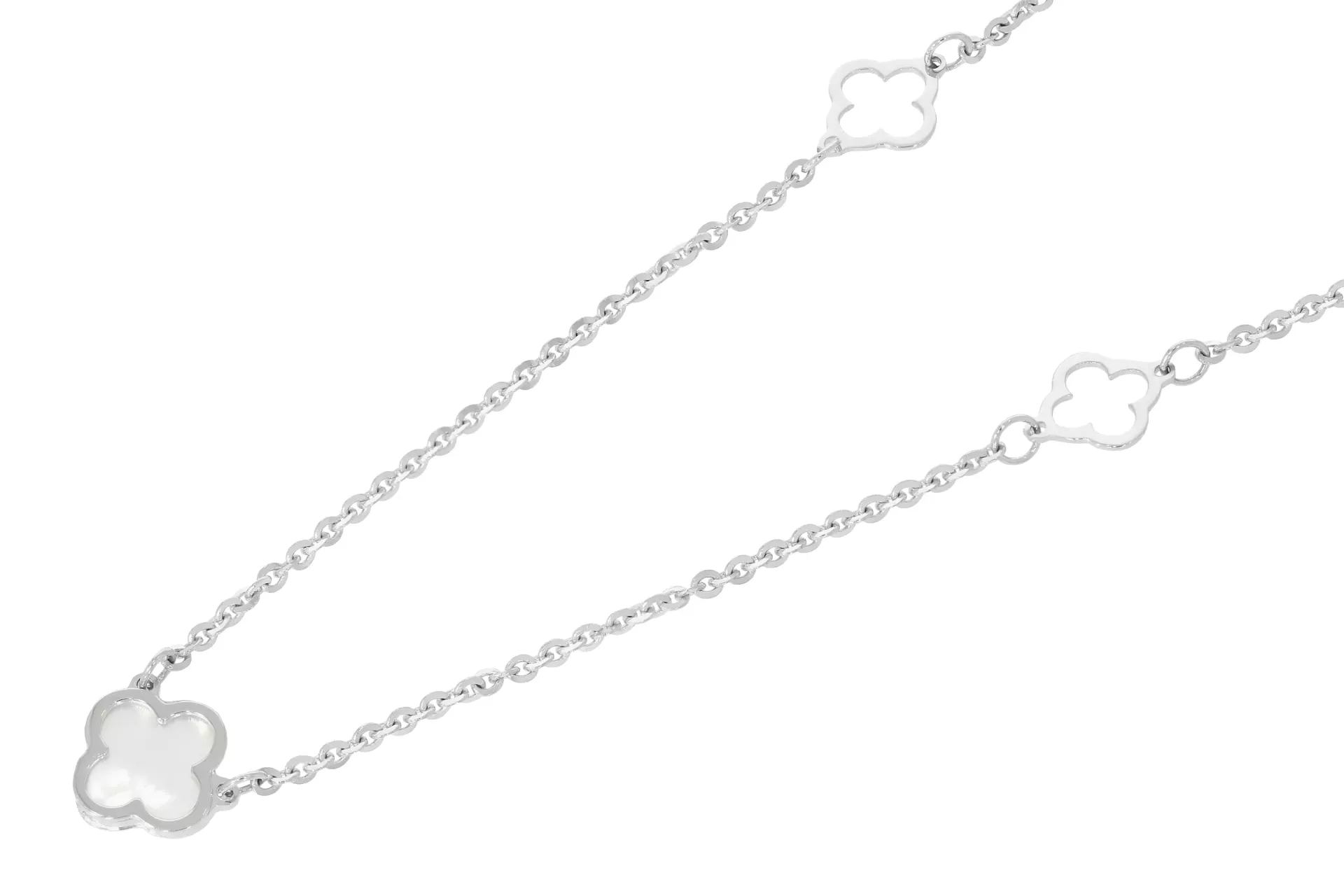 Obľúbený perleťový motív štvorlístka s priemerom 10mm zdobí krásnu retiazku z bieleho zlata. Vyrezávané štvorlístky s priemerom 8mm dodávajú šperku ten správny šmrnc. Dĺžka retiazky je regulovateľná na 42cm alebo 45cm.
