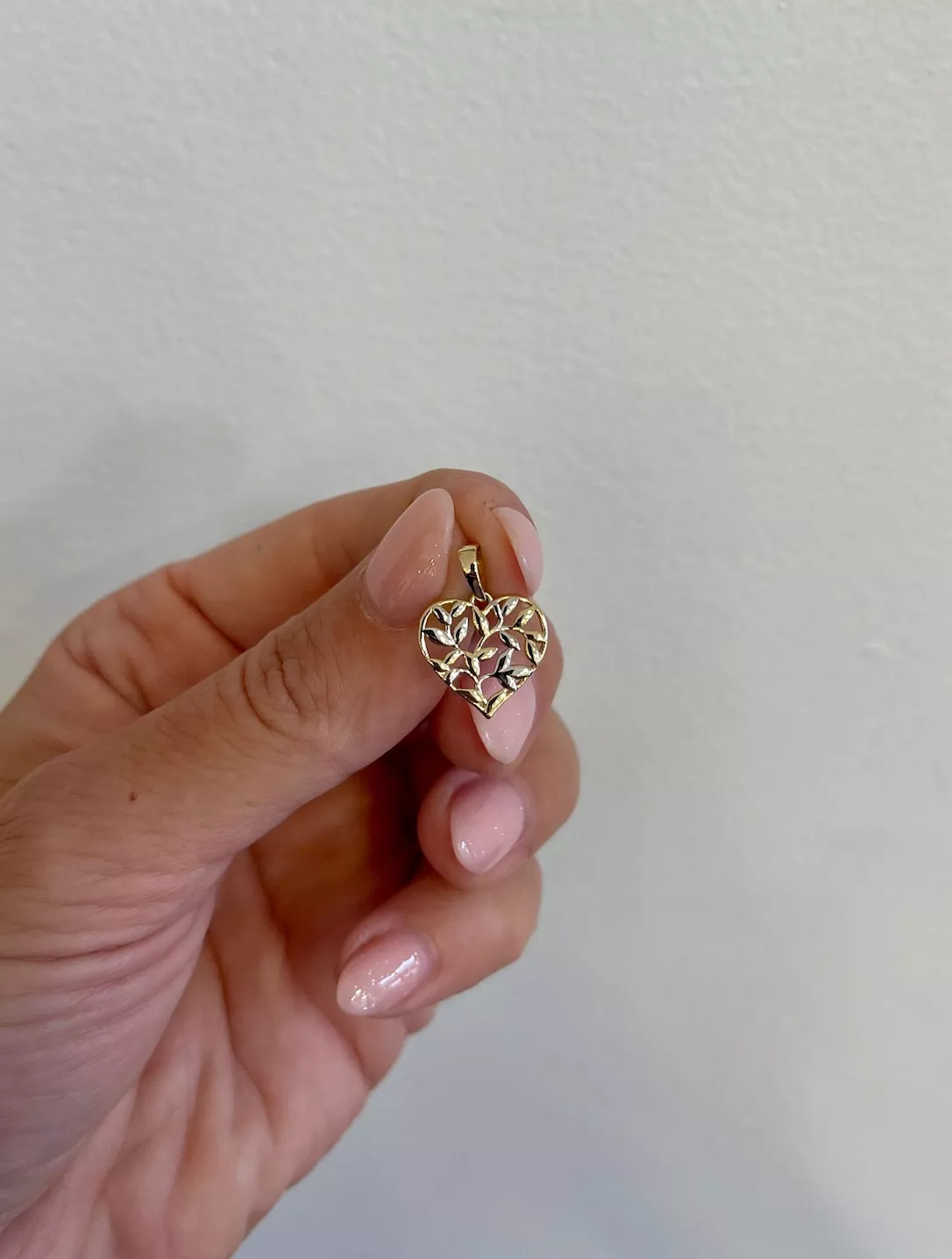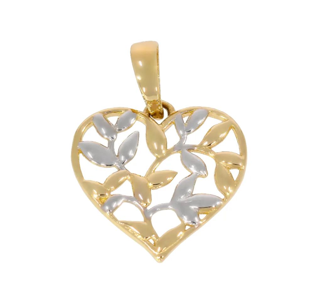 Pekné moderné srdiečko vyplnené lístkami je vyrobené kombináciou žltého a bieleho zlata. Prívesok má lesklú povrchovú úpravu a je vhodný aj ako darček.