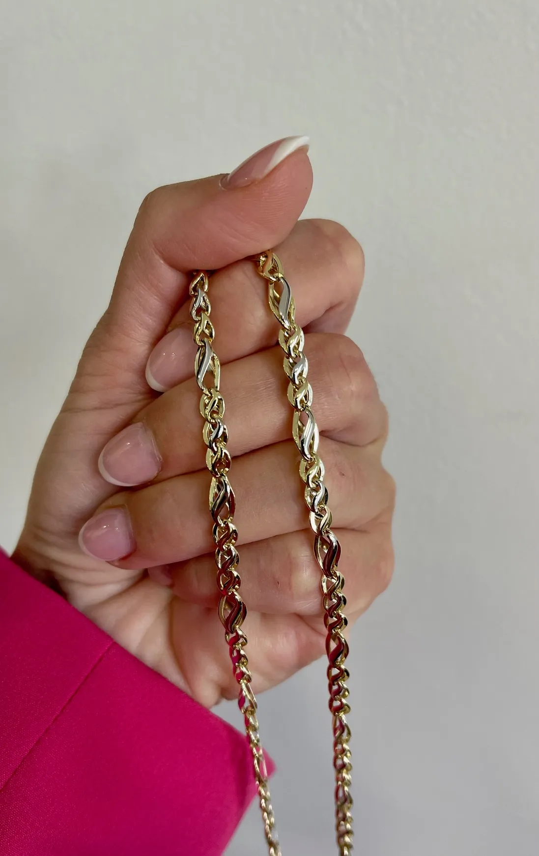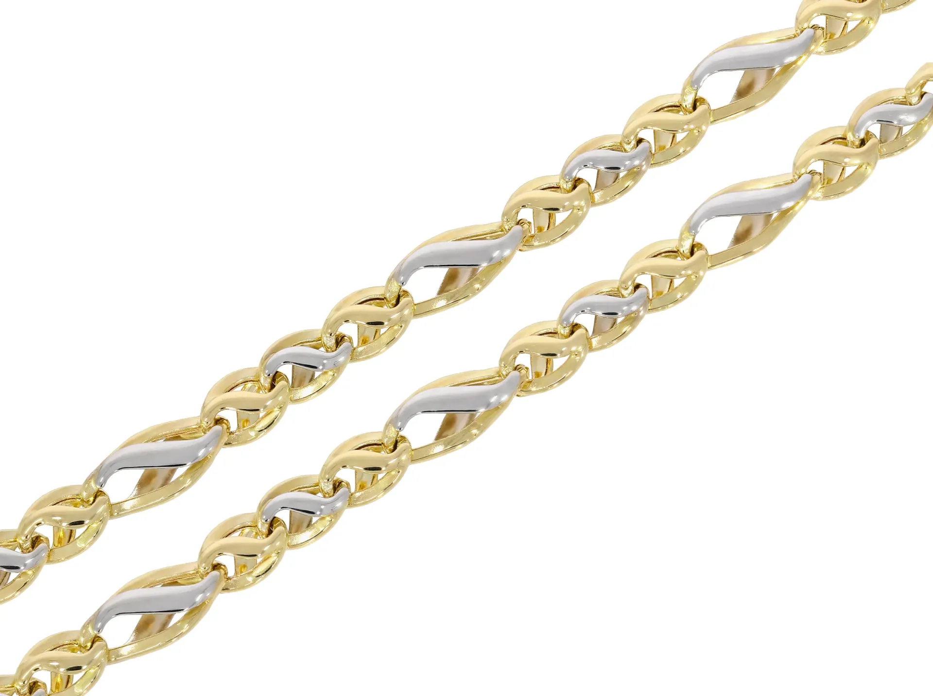 Krásna zlatá retiazka s moderným dizajnom, vyrobená zo žltého a bieleho 14k zlata. Použité zapínanie má tvar karabínky. Spolu so Zlatým náramkom 1280 vytvára krásnu súpravu.