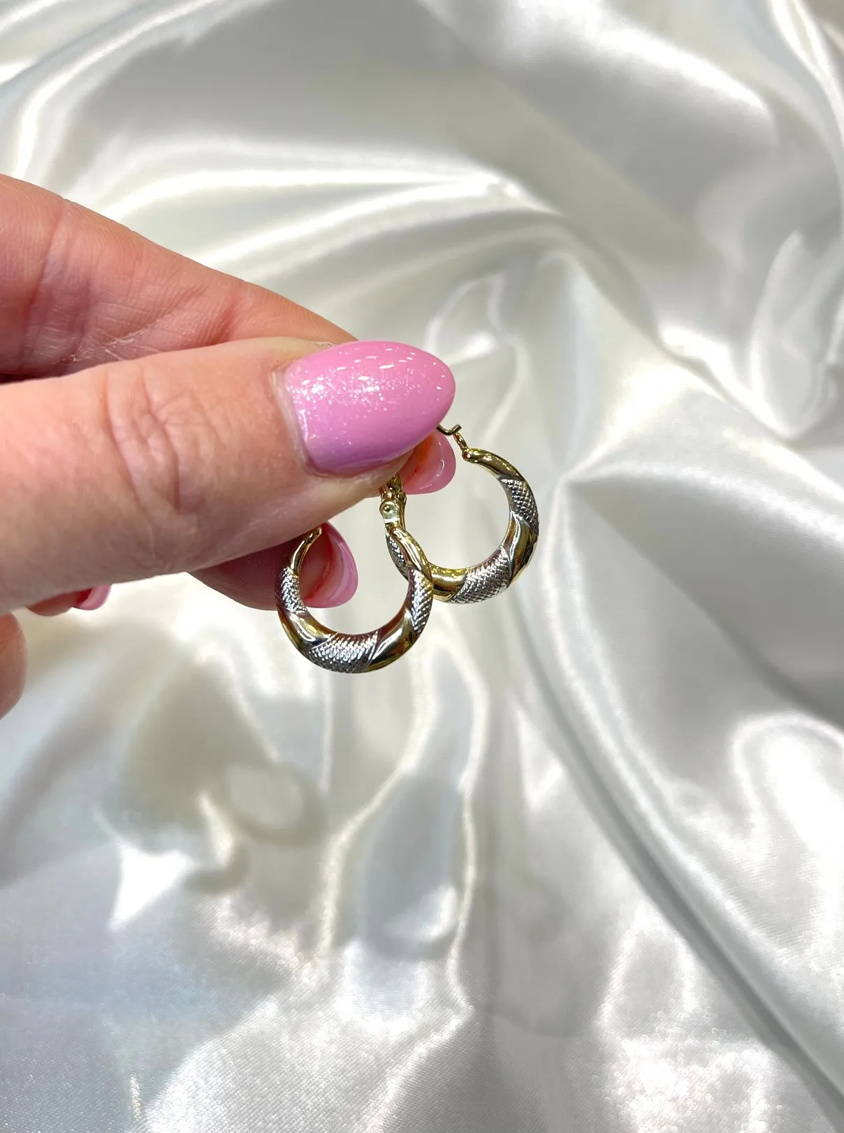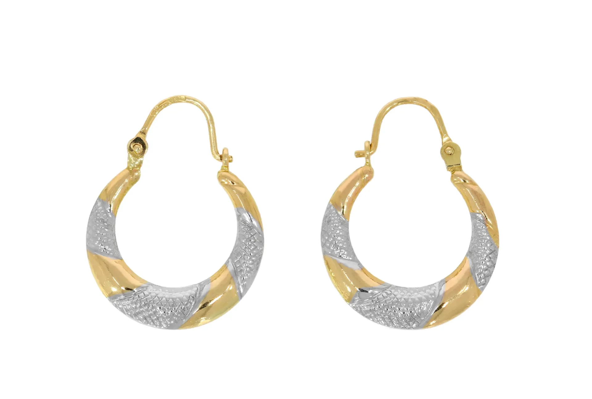 Praktické zlaté krúžky zdobí z jednej strany biele tónovanie zlata a gravírovaný vzor. Druhá strana šperku je vyrobená zo žltého zlata, náušnice je tak možné nosiť obojstranne.