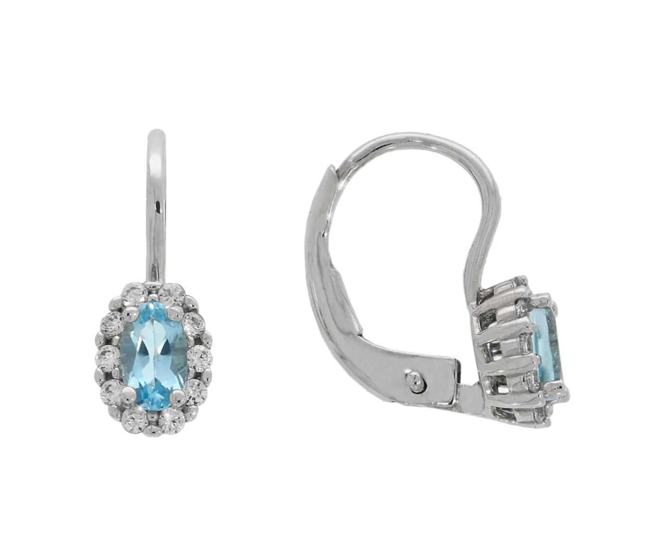 Pekné náušnice z bieleho 14k zlata sú zdobené modrým topazom, ktorý po obvode dopĺňajú biele zirkóny. Náušnice sa zapínajú na klasický patent a sú vhodné aj ako darček.
