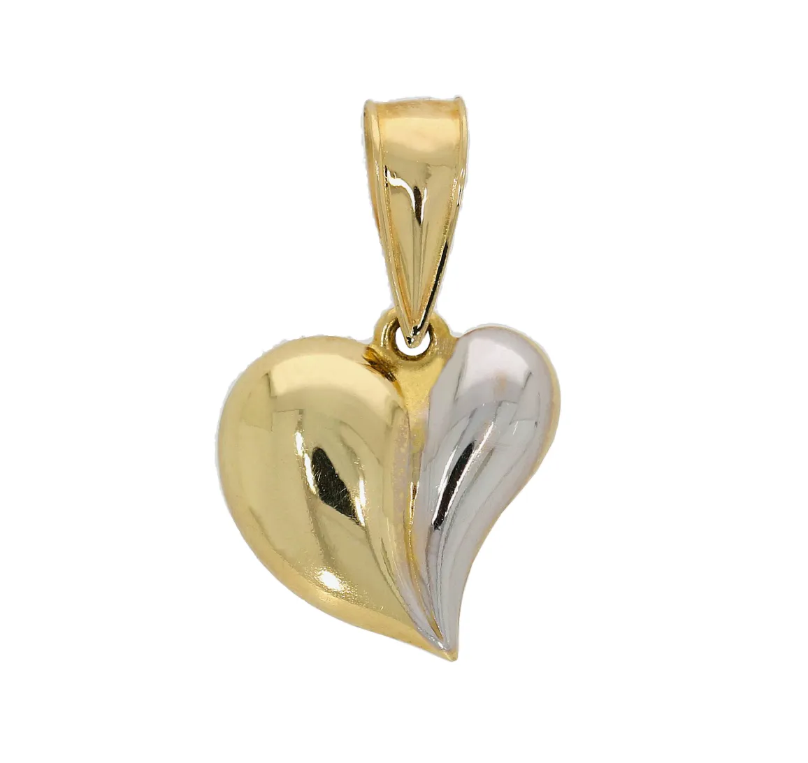 Pekný prívesok zo žltého a bieleho 14 karátového zlata má tvar jemne vypuklého srdiečka. Prívesok má hladký, lesklý povrch z prednej strany je polovička srdiečka bielej farby, zadná strana prívesku je celá zo žltého zlata.