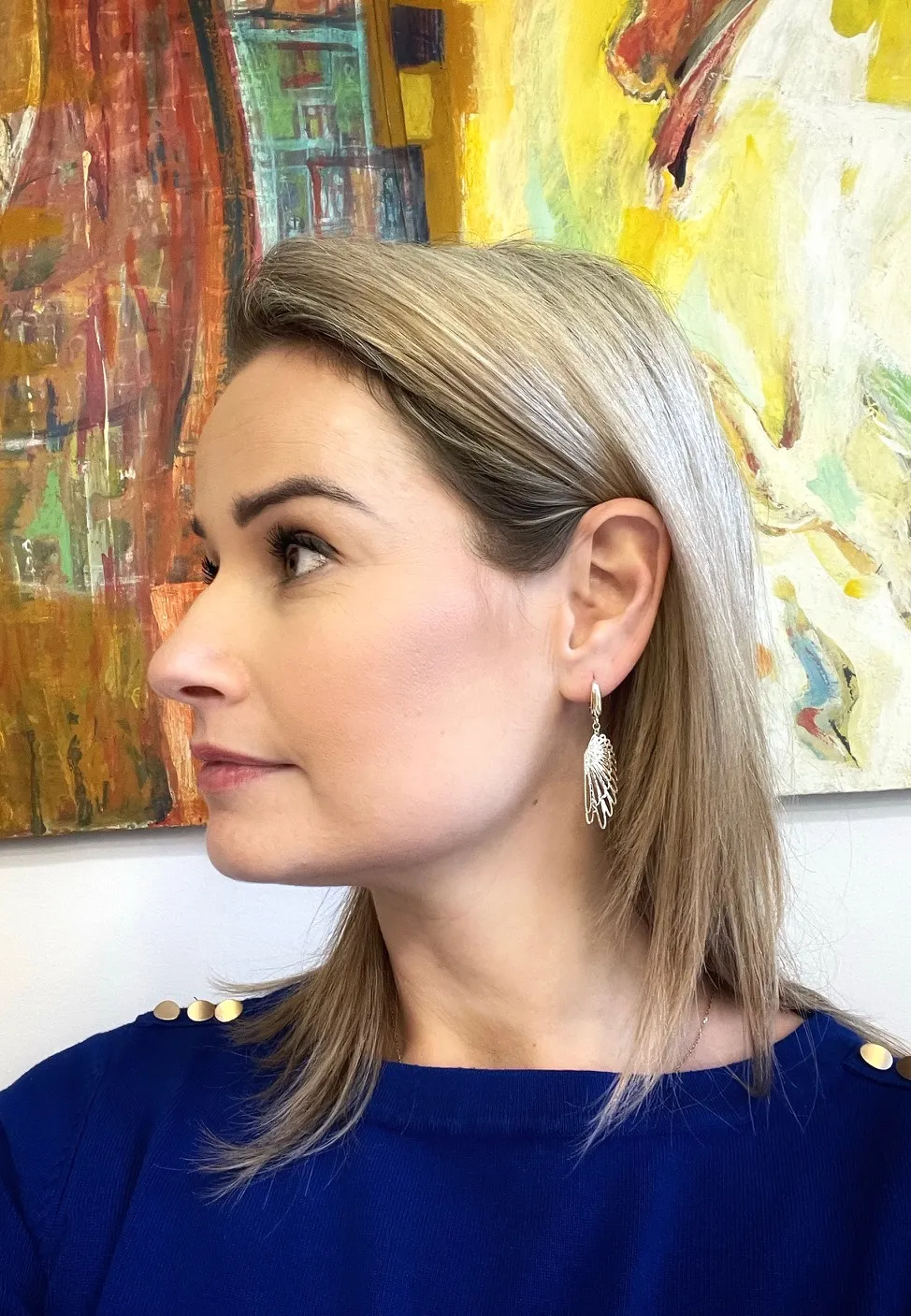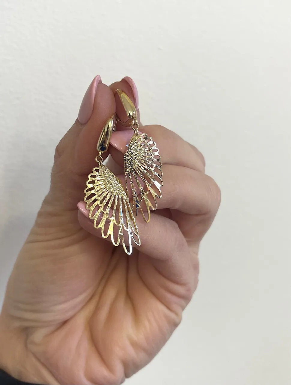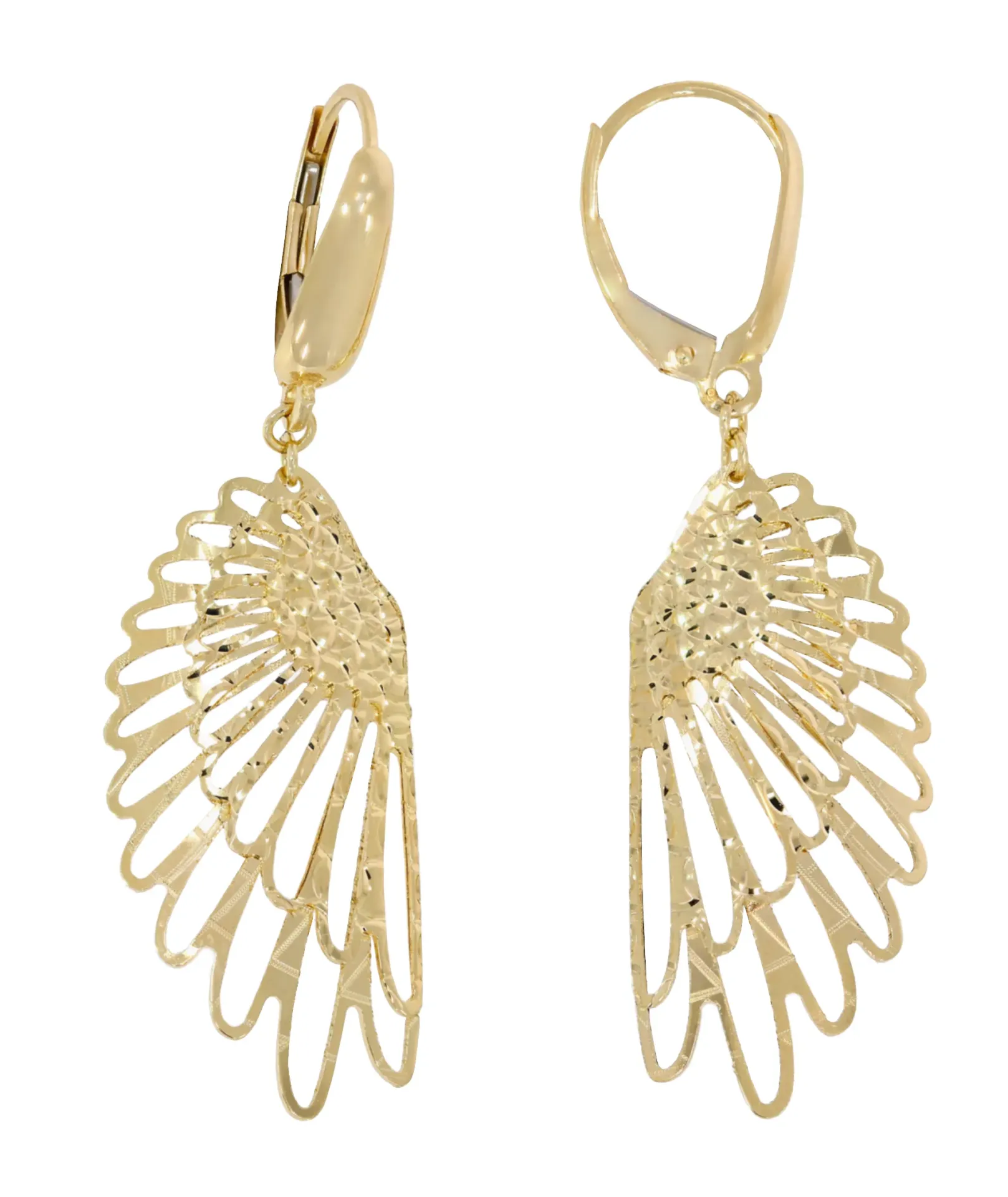 Skutočne krásne, výrazné zlaté visiace náušnice vyrobené zo žltého 14 karátového zlata v tvare krídiel. Náušnice majú trblietavý gravírovaný vzor a klasické patentové zapínanie.