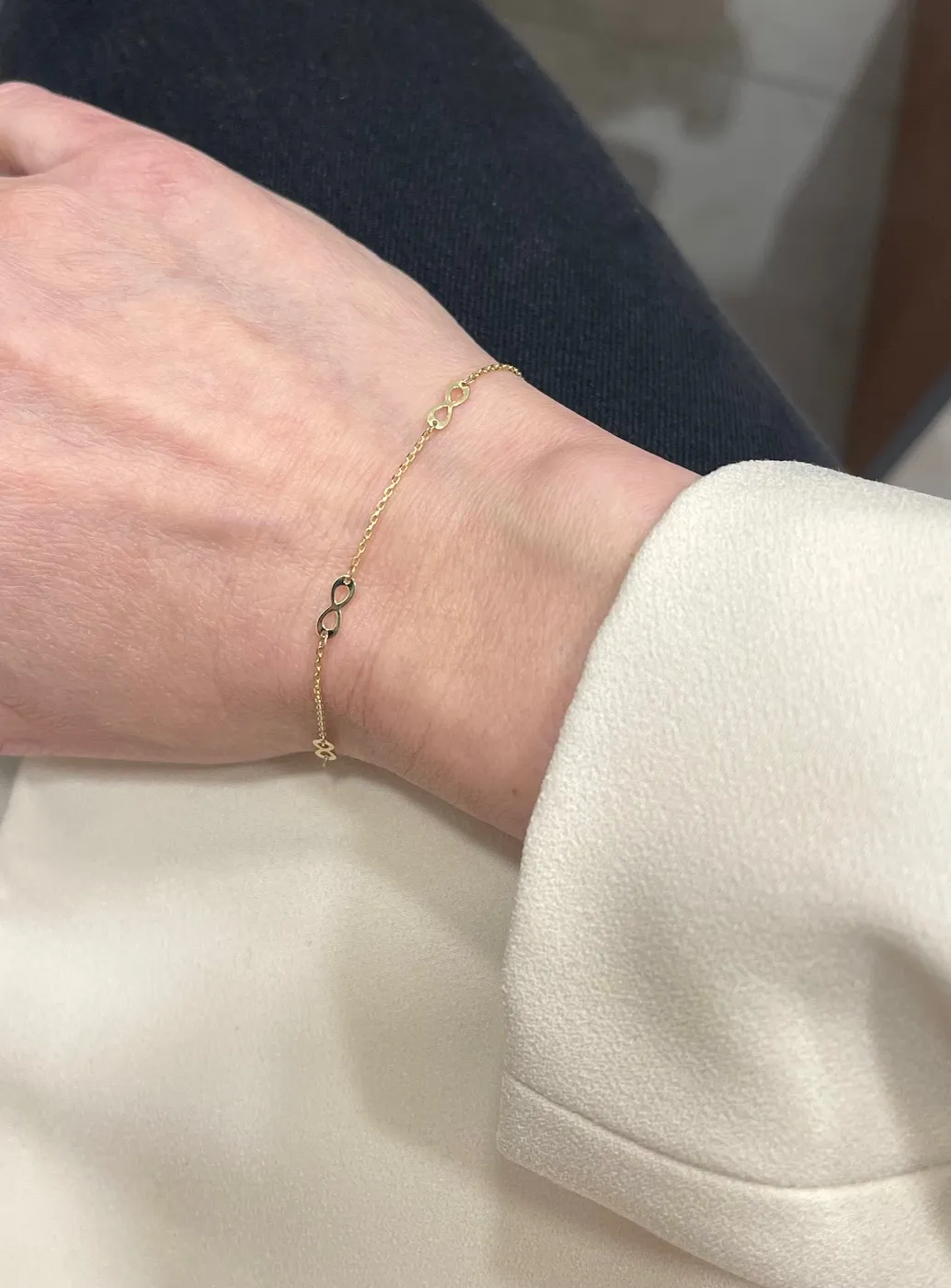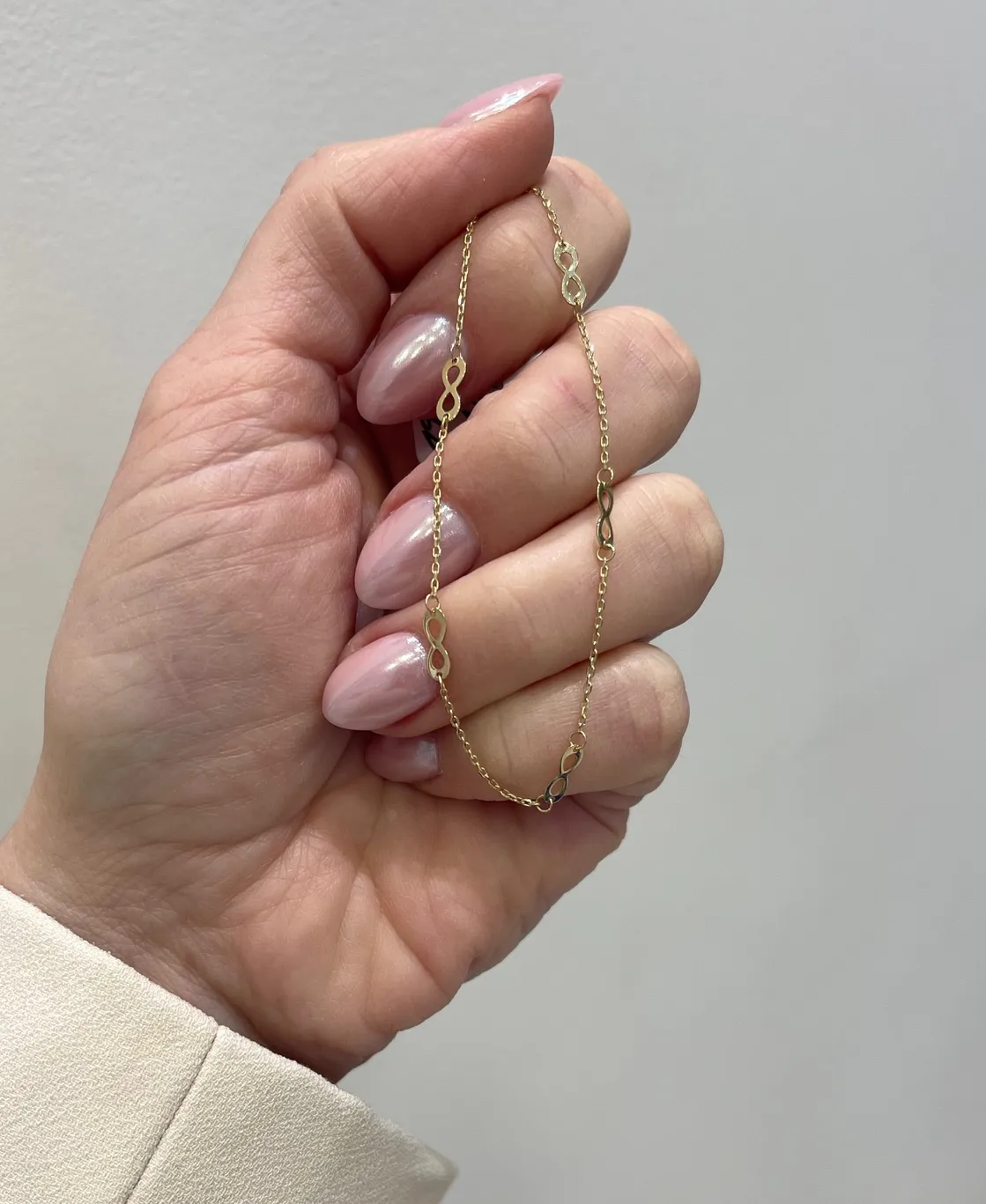 Jemný zlatý náramok zdobený symbolom nekonečna.