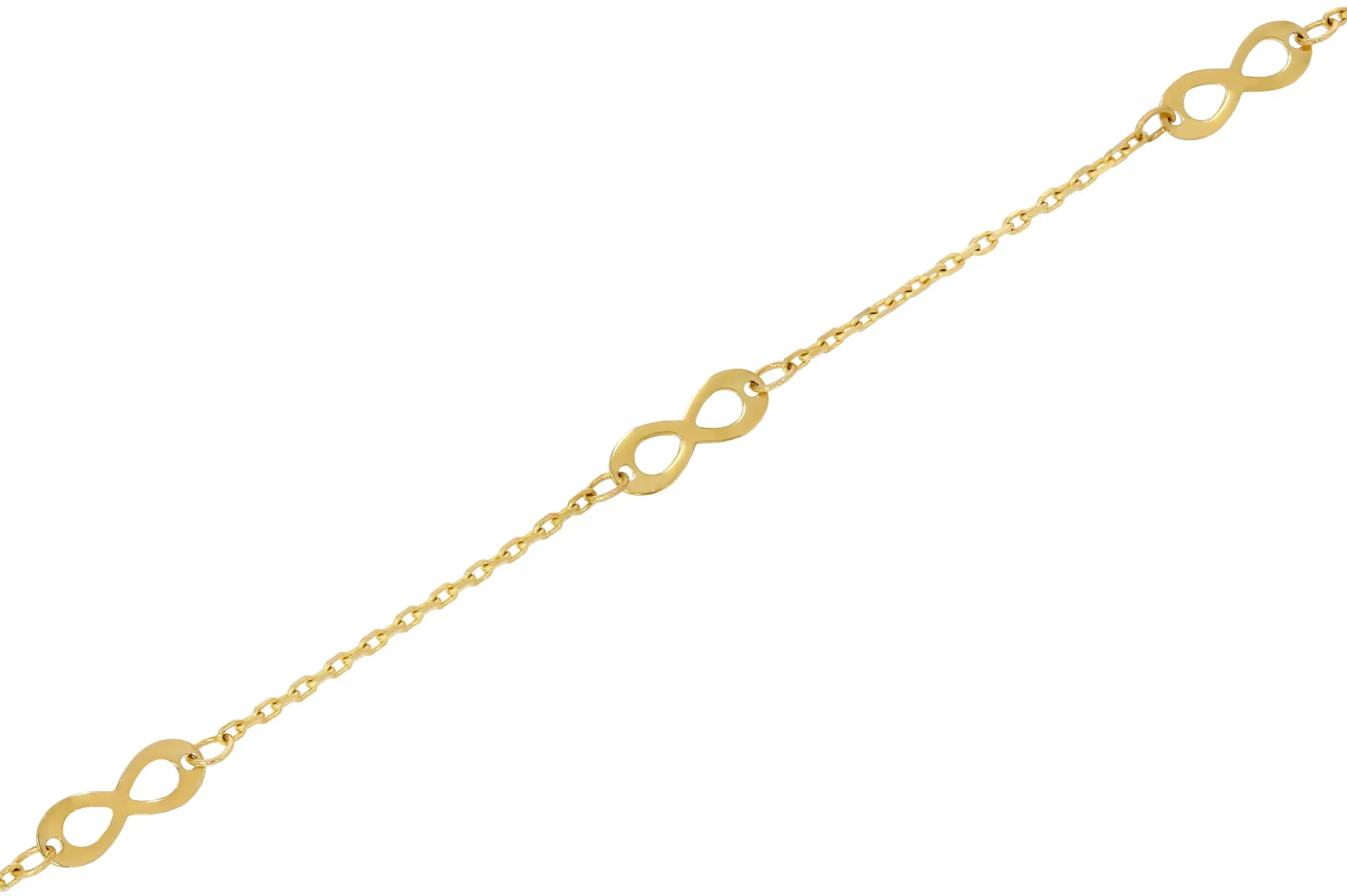 Pekný zlatý náramok zdobený piatimi symbolmi nekonečna je vyrobený zo žltého zlata a má lesklú povrchovú úpravu. Náramok má plné očká a zapína sa na pérový krúžok.
