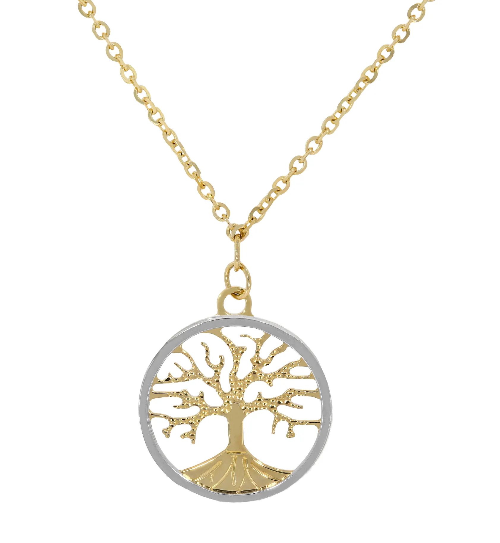Pekná, plná retiazka zdobená obľúbeným motívom strom života s priemerom 14mm. Prívesok zdobí z prednej strany biele tónovanie zlata a gravírovaný vzor. Zadná strana šperku je hladká, lesklá. Zlatá retiazka je zdobená tiež príveskom v tvare srdiečka so šírkou 6mm. Dĺžka retiazky je regulovateľná na 42cm alebo 45cm. Zapínanie má tvar karabínky.
