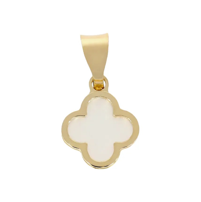 Krásny zlatý štvrolístok vyrobený zo žltého 14k zlata zdobený bielou perleťou.