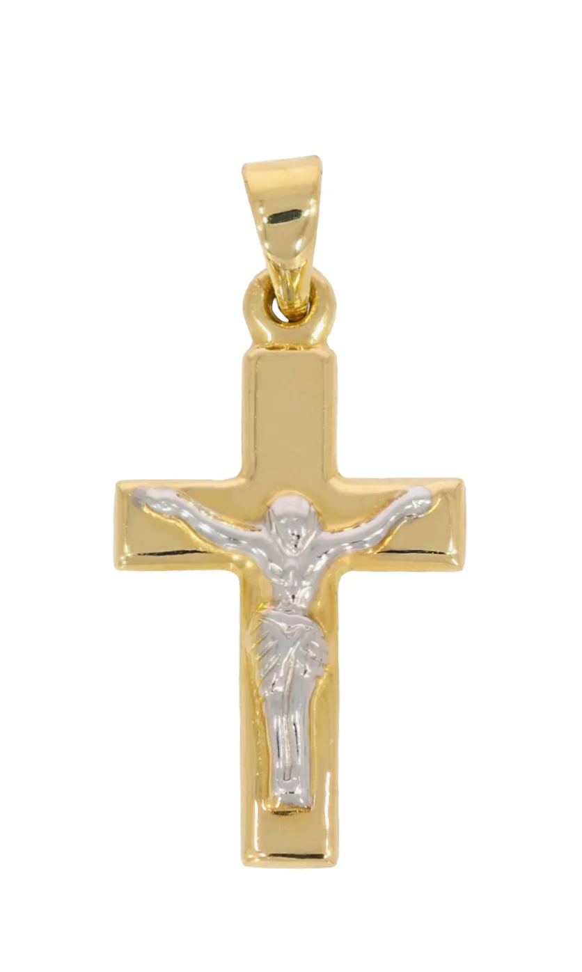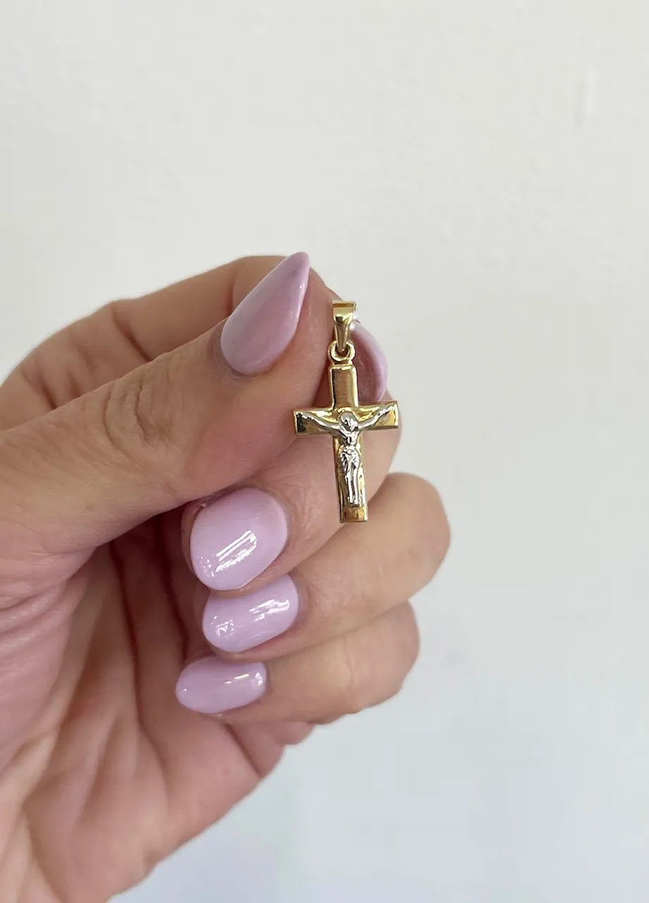 Prívesok v tvare zlatého krížika zobrazuje ukrižovanie Ježiša.