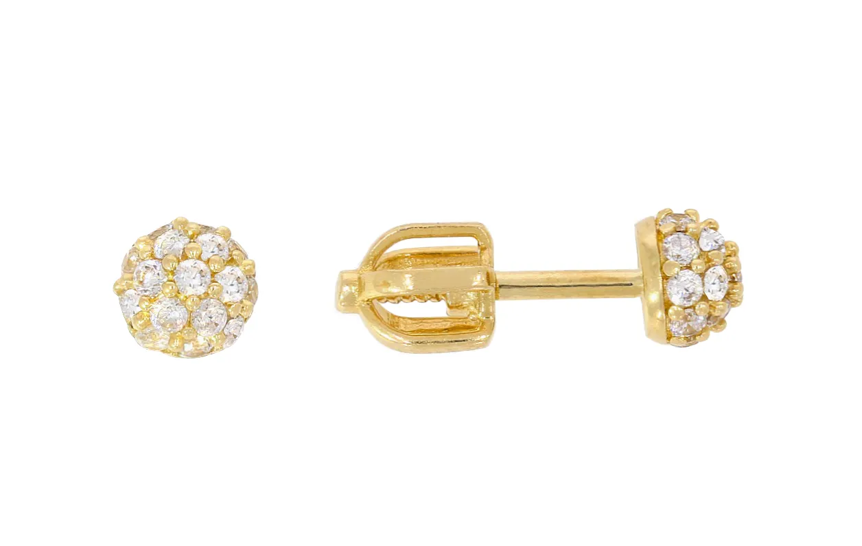 Pekné zlaté náušnice zdobené množstvom bielych zirkónov majú bezpečné šrobovacie zapínanie.