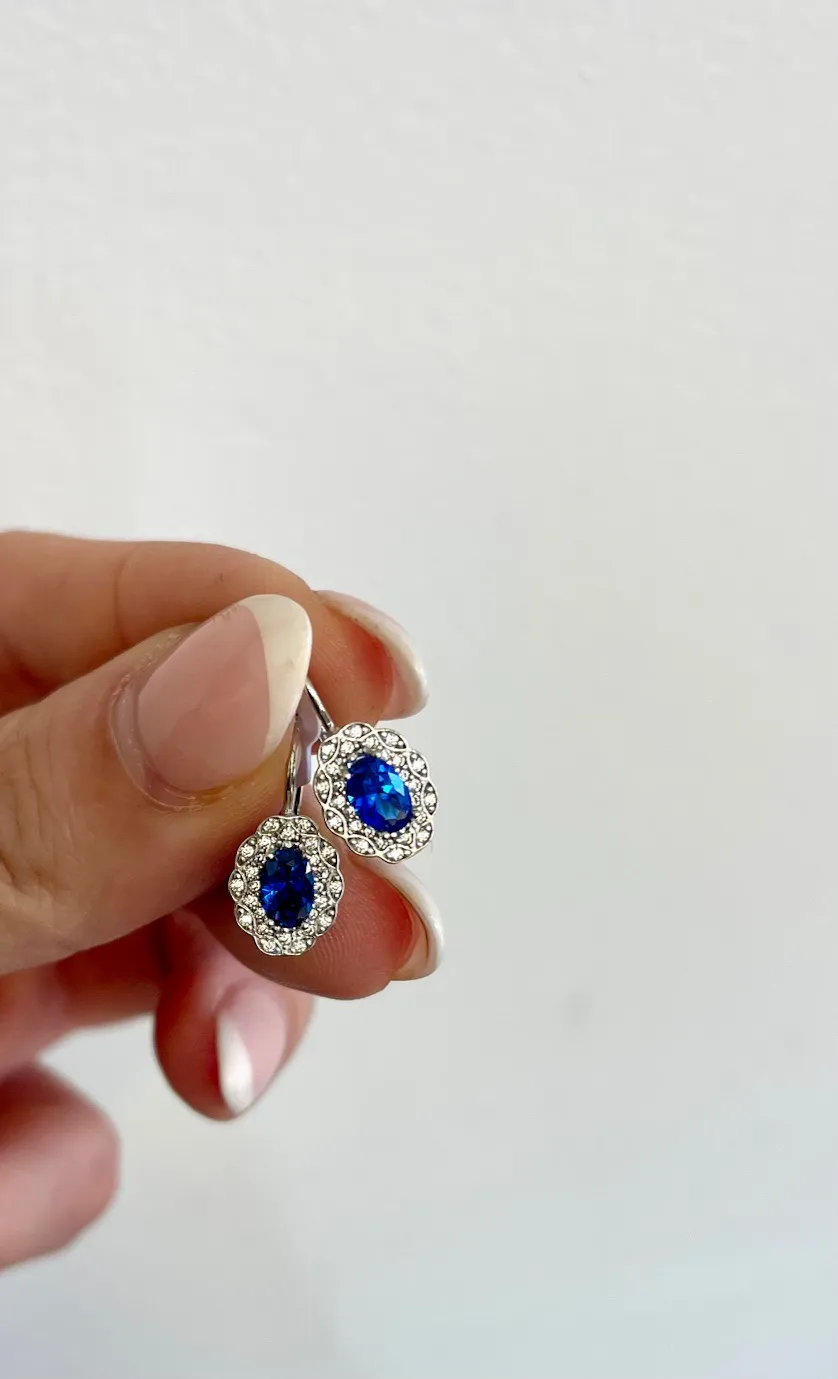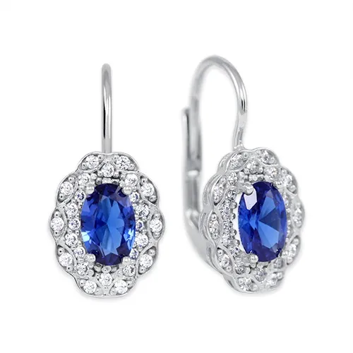 Krásne náušnice z bieleho zlata zdobené tmavomodrým zirkónom, ktorý dopĺňajú menšie biele zirkóny.