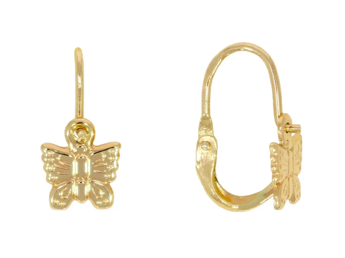Jemné zlaté náušnice vyrobené zo žltého 14k zlata v tvare motýľov. Vďaka bezpečnému zapínaniu spredu sú vhodné pre bábätká už od narodenia.