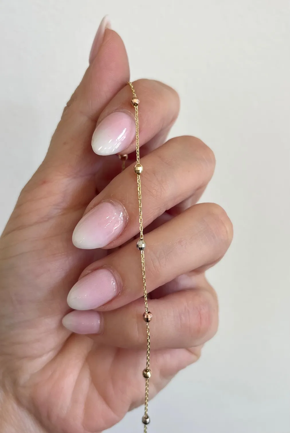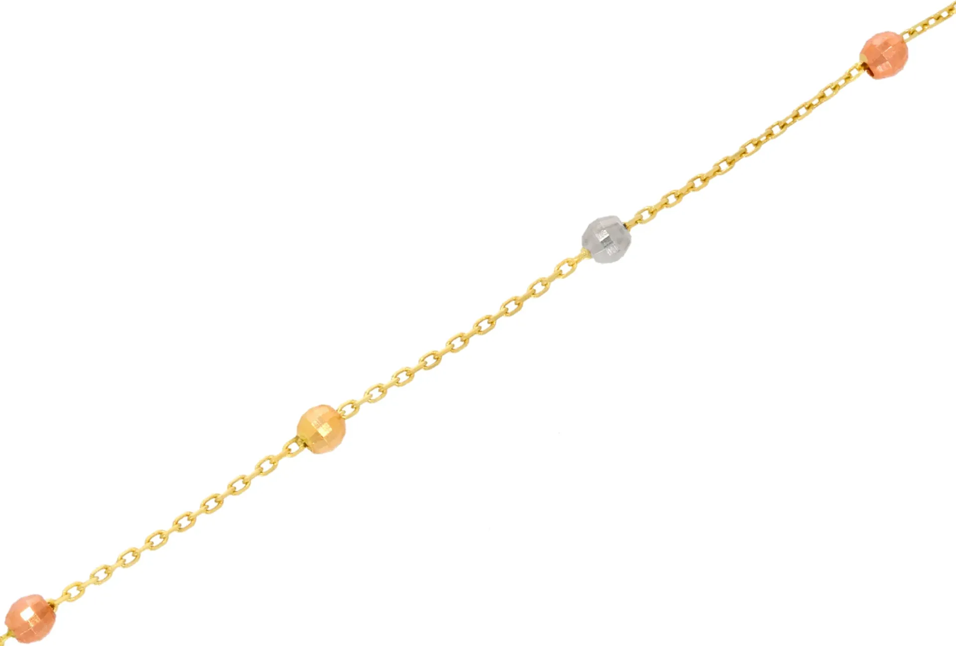 Pekná retiazka vyrobená zo žltého 14k zlata je zdobená bielymi, žltými a ružovými gravírovanými guľkami s priemerom 3mm. Retiazka má regulovateľnú dĺžku v rozmedzí 3cm. Zapínanie má tvar pérového krúžku.