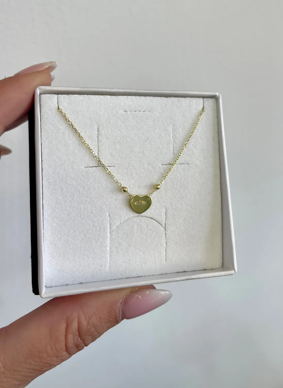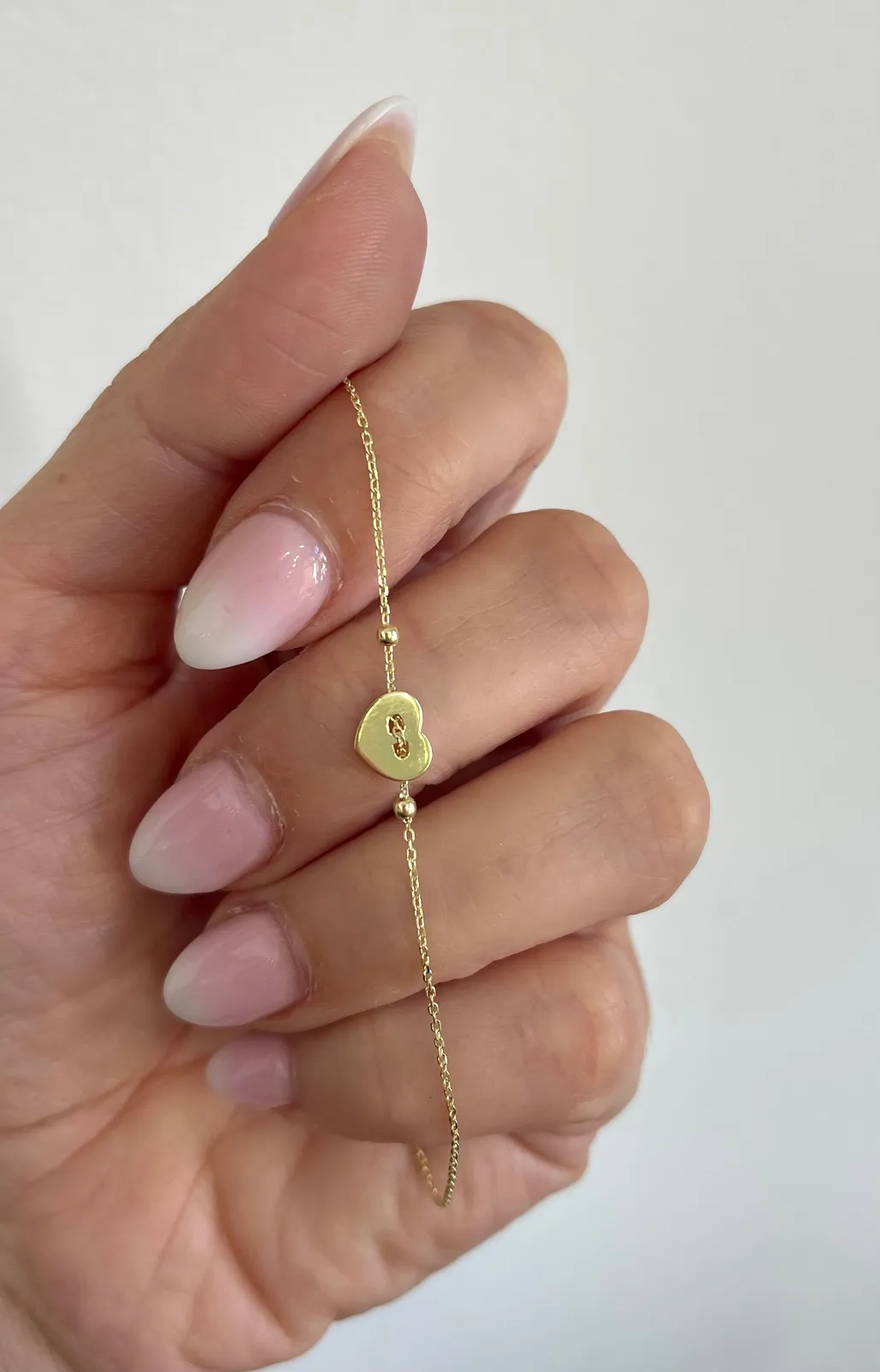 Pekný náramok vyrobený zo žltého 14k zlata zdobí prevlečené srdiečko s rozmermi 6x8mm. Po stranách ho ohraničujú hladké, lesklé guľky s priemerom 3mm. Náramok má dĺžku regulovateľnú v rozmedzí 3cm. Zapínanie má tvar pérového krúžku.