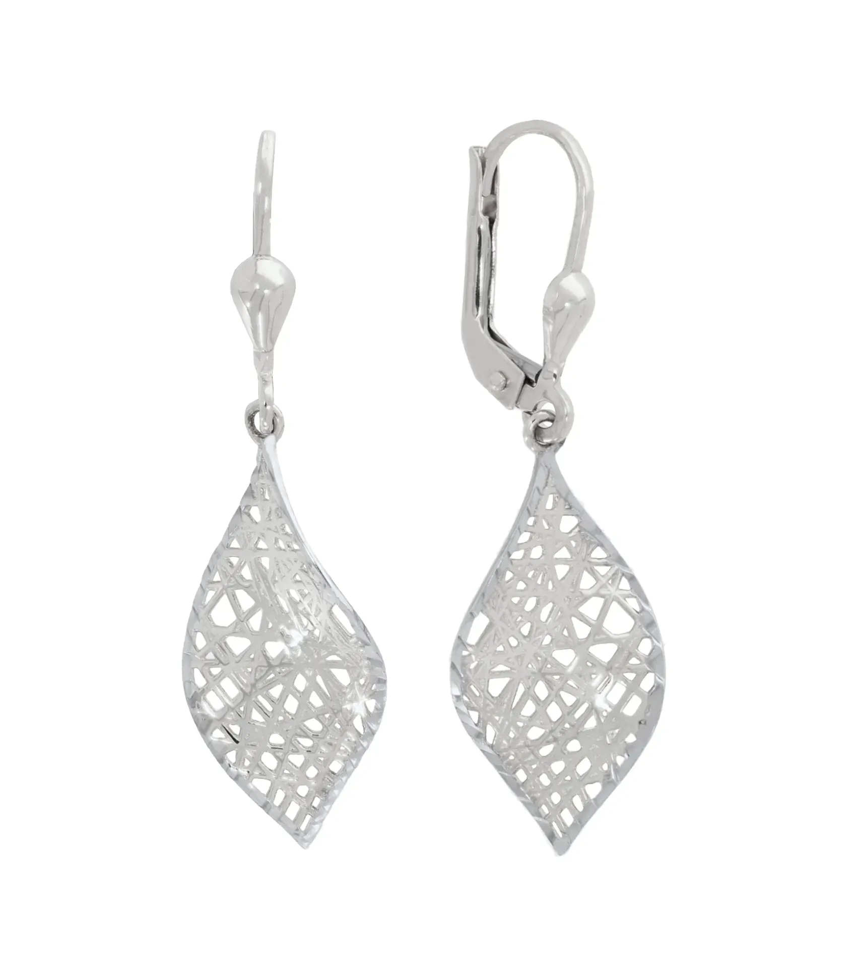 Elegantné visiace náušnice z bieleho zlata majú visiacu časť zdobenú vyrezávaným motívom.