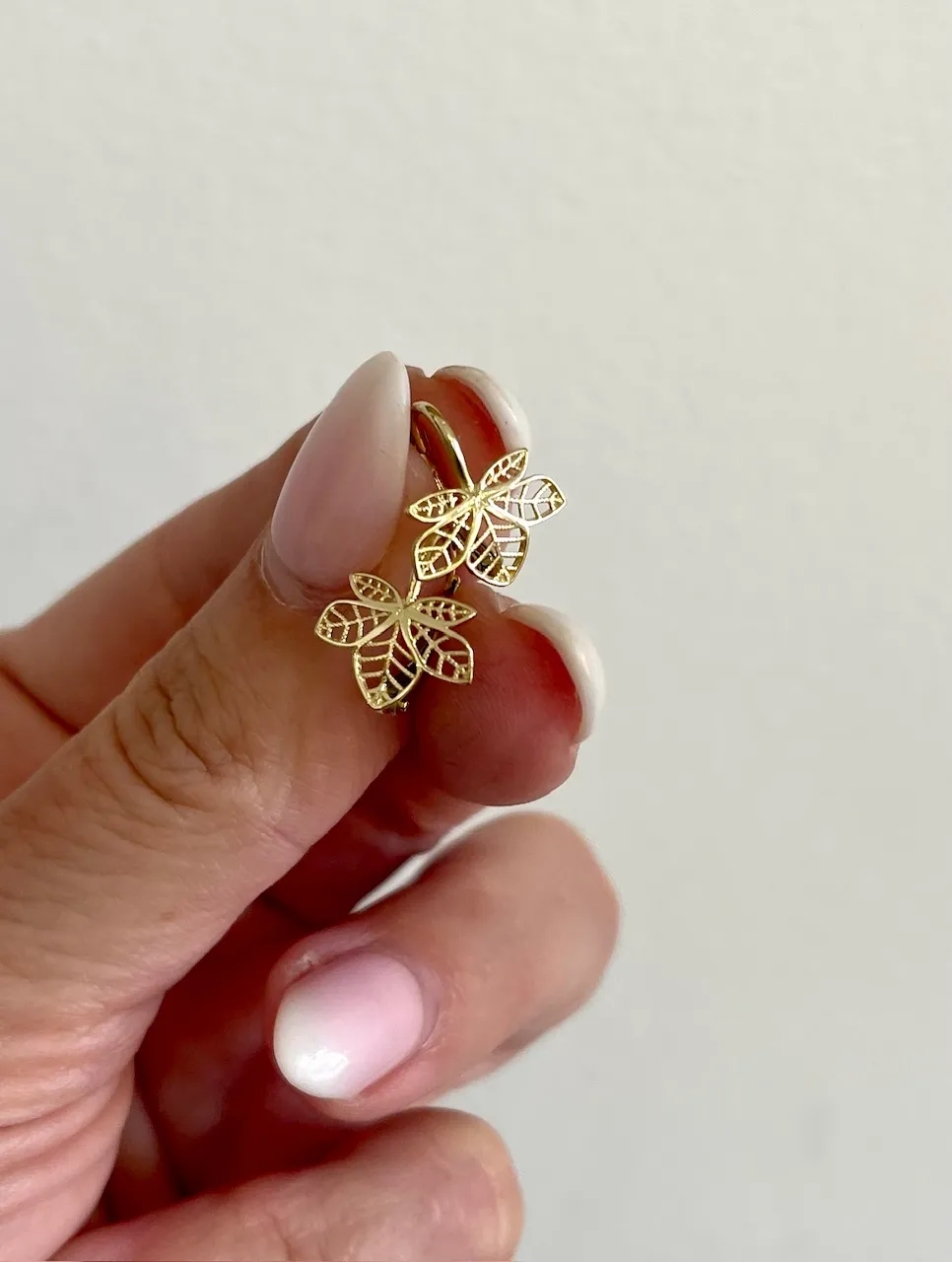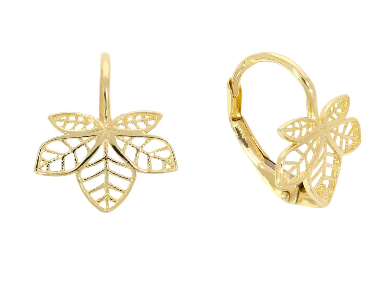 Pekné zlaté náušnice vyrobené v tvare lístkov s precízne vyrezávaným vzorom sa zapínajú na klasický patent. Náušnice vyrobené zo žltého 14 karátového zlata sú vhodné pre dievčatá alebo dámy s menšími ušnými lalokmi.