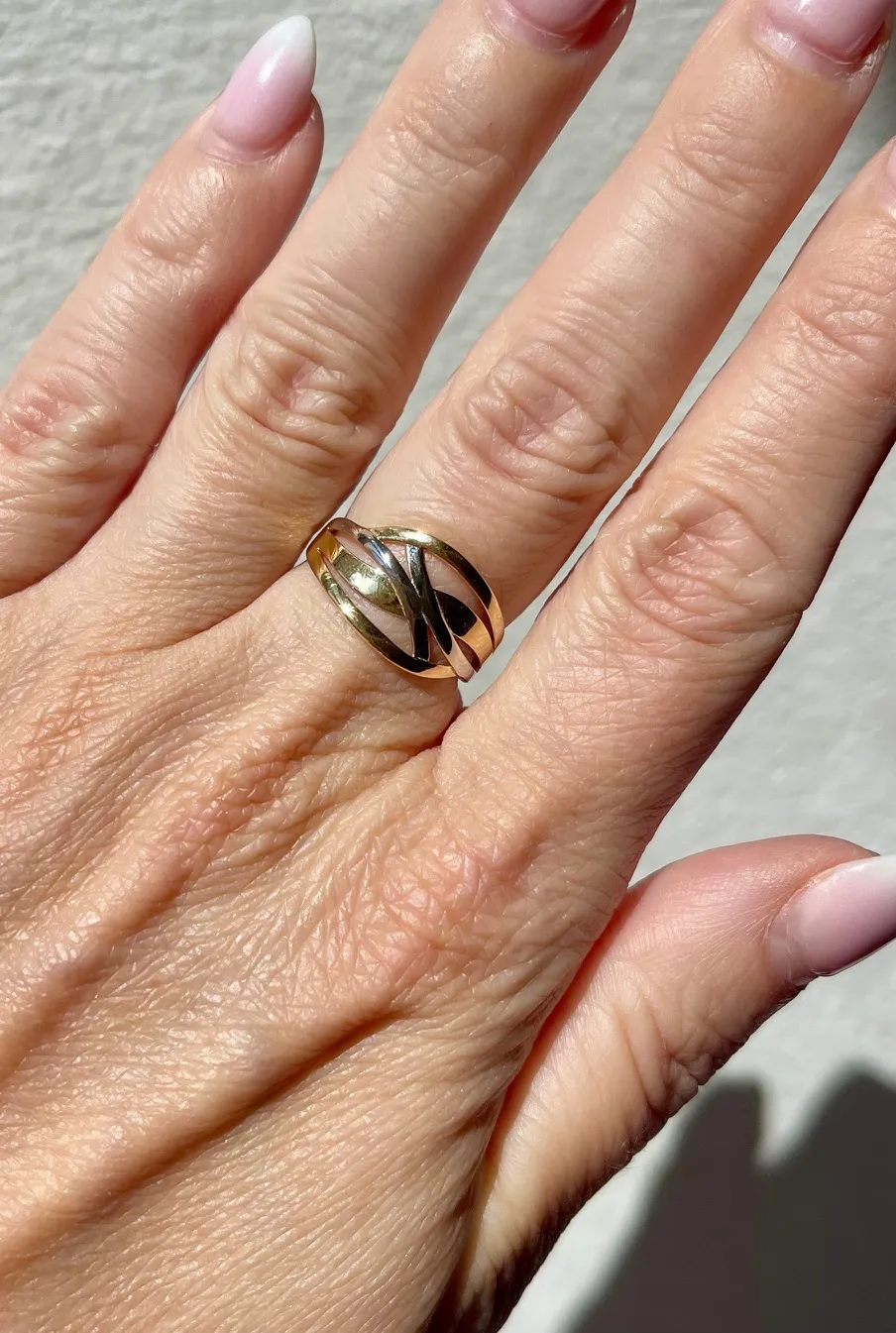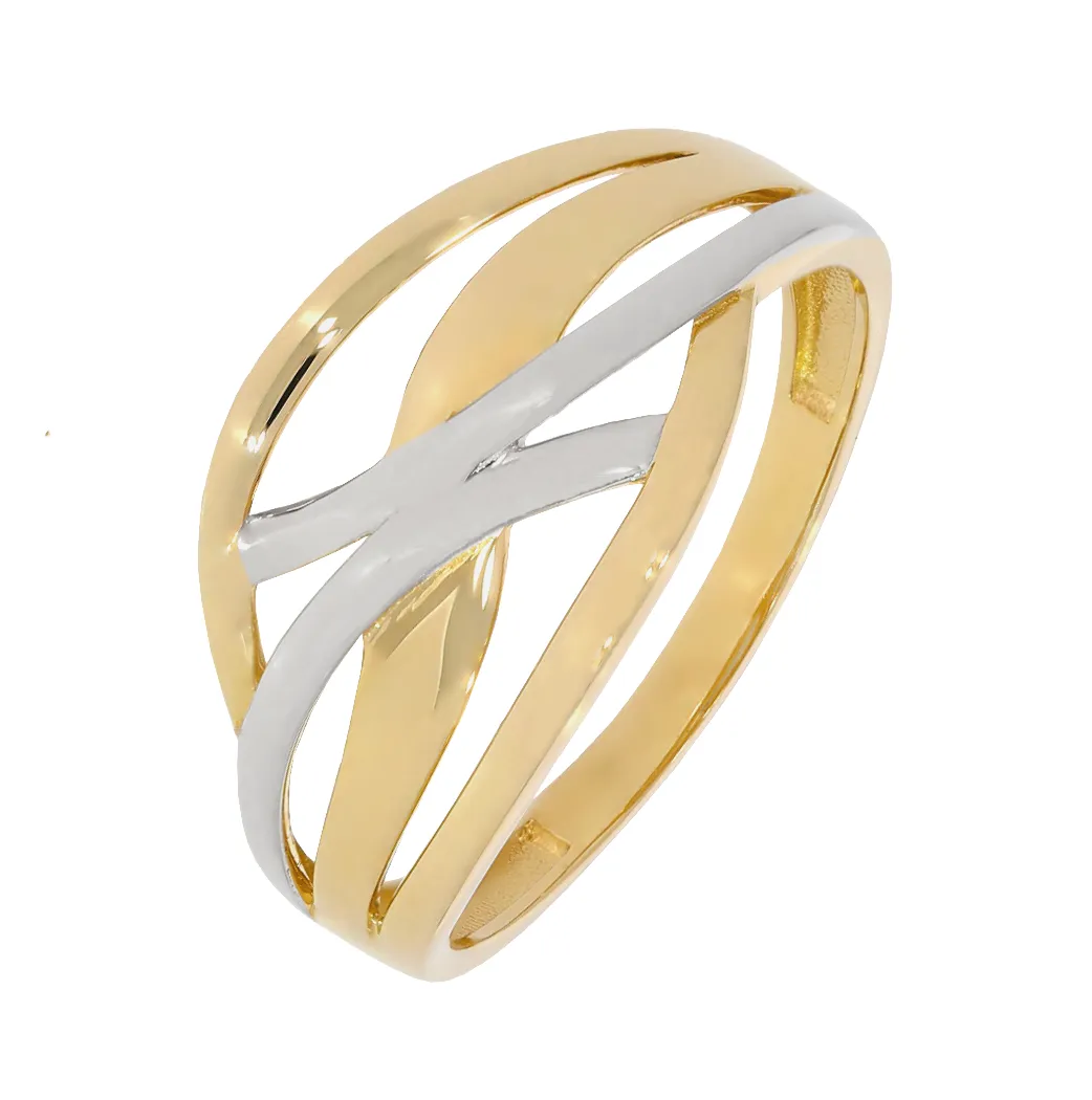 Skutočne veľmi pekný, výrazný dámsky zlatý prsteň v sebe spája prepletené línie bieleho a žltého 14 karátového zlata. Lesklá povrchová úprava dotvára celkový dizajn šperku.