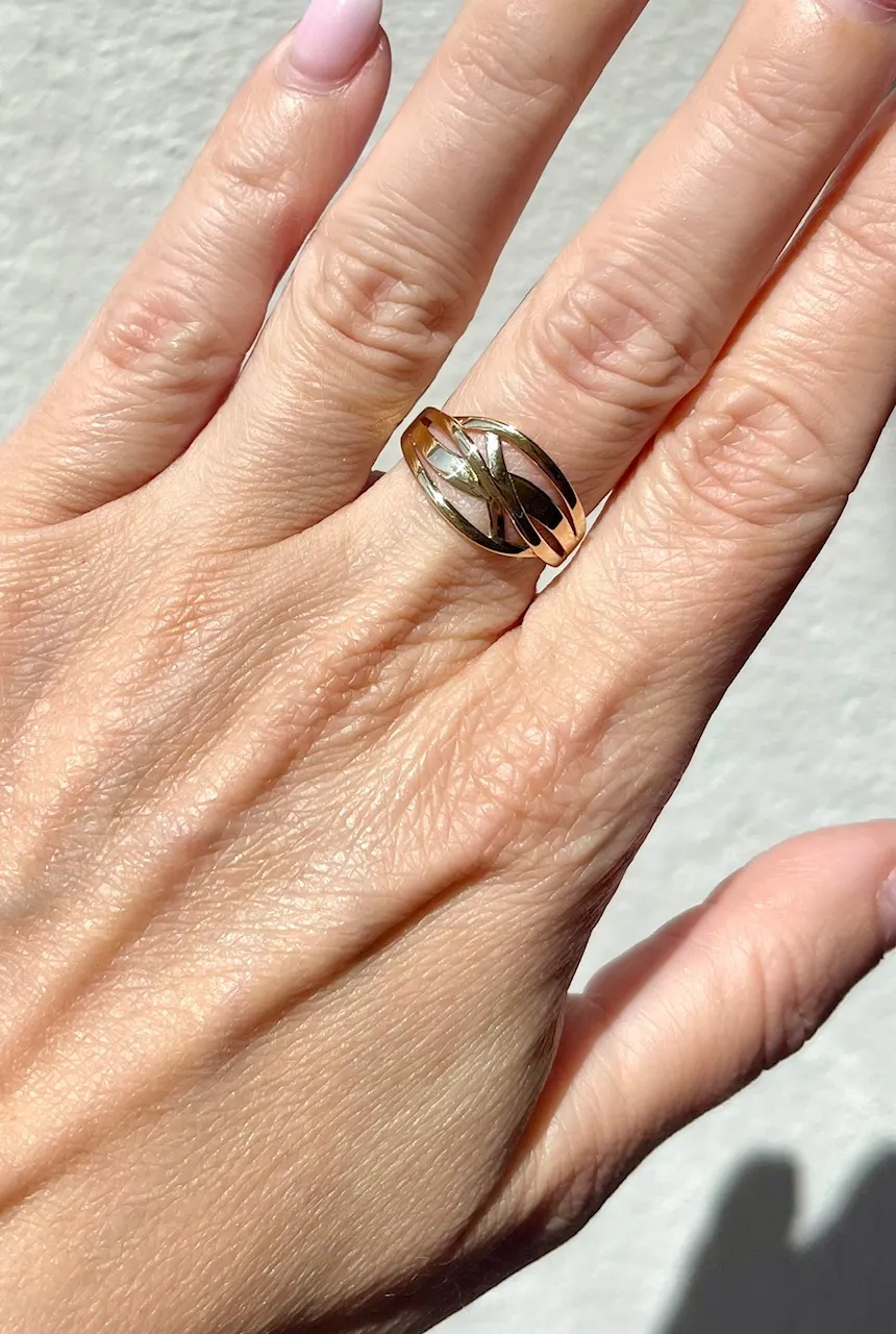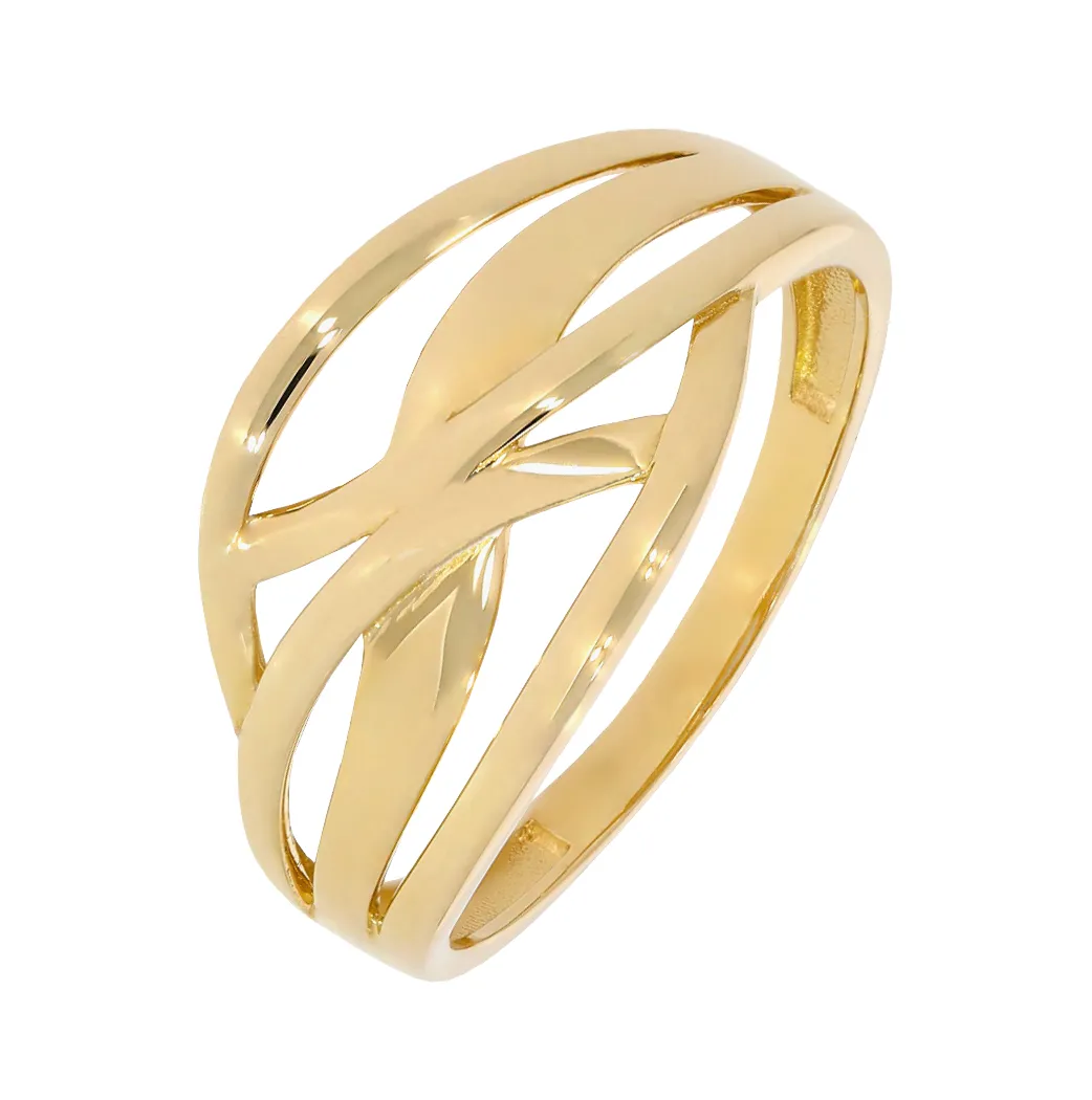 Výrazný dámsky zlatý prsteň vyrobený zo žltého 14 karátového zlata s lesklou povrchovou úpravou. Prsteň vďaka praktickému tvaru krásne prilnie k prstu.