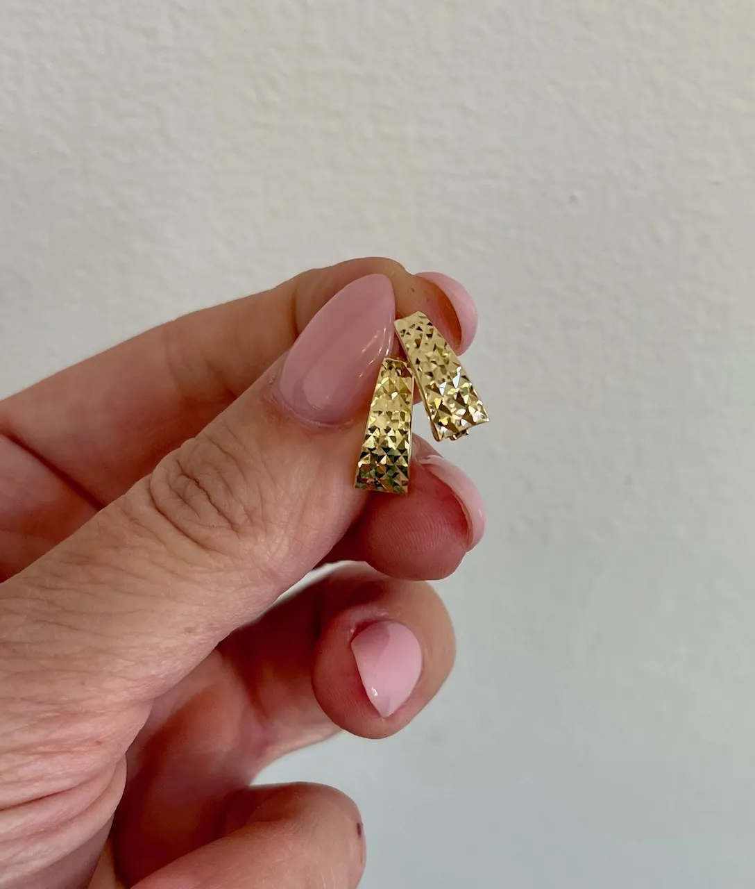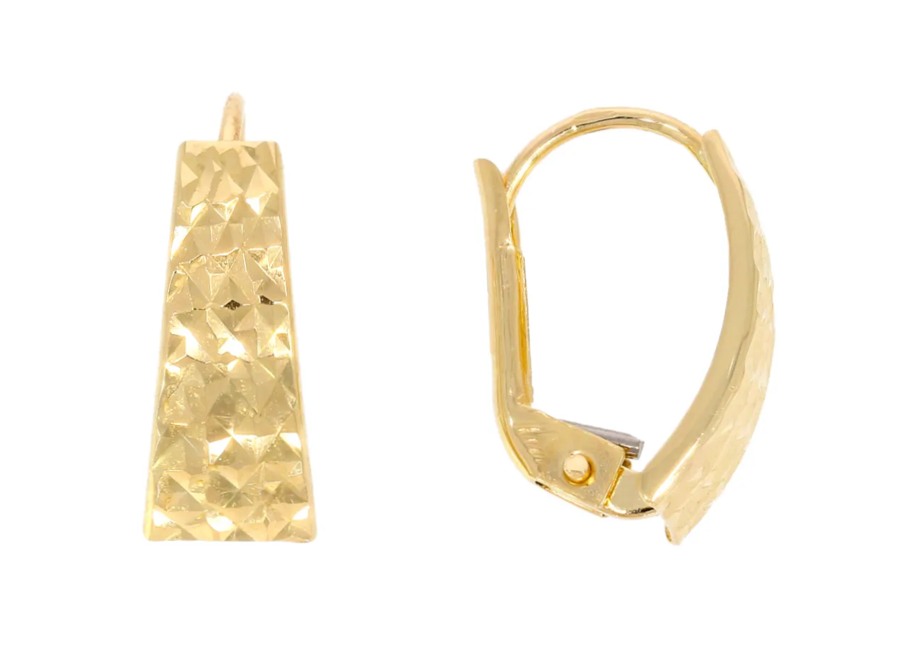 Zlaté náušnice zdobené gravírovaným vzorom sú vďaka bezpečnému zapínaniu vhodné na kažodenné nosenie.