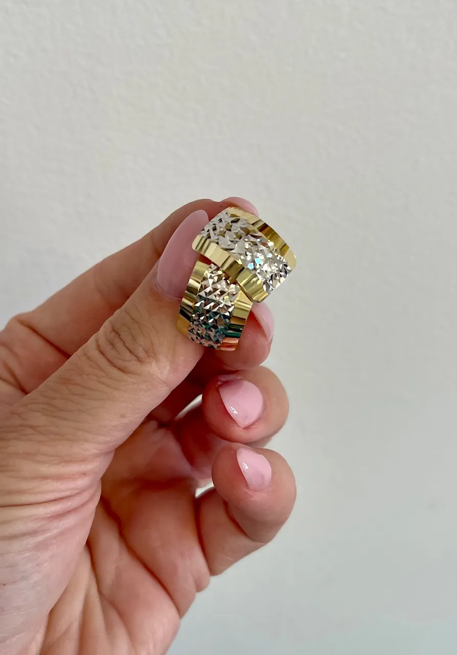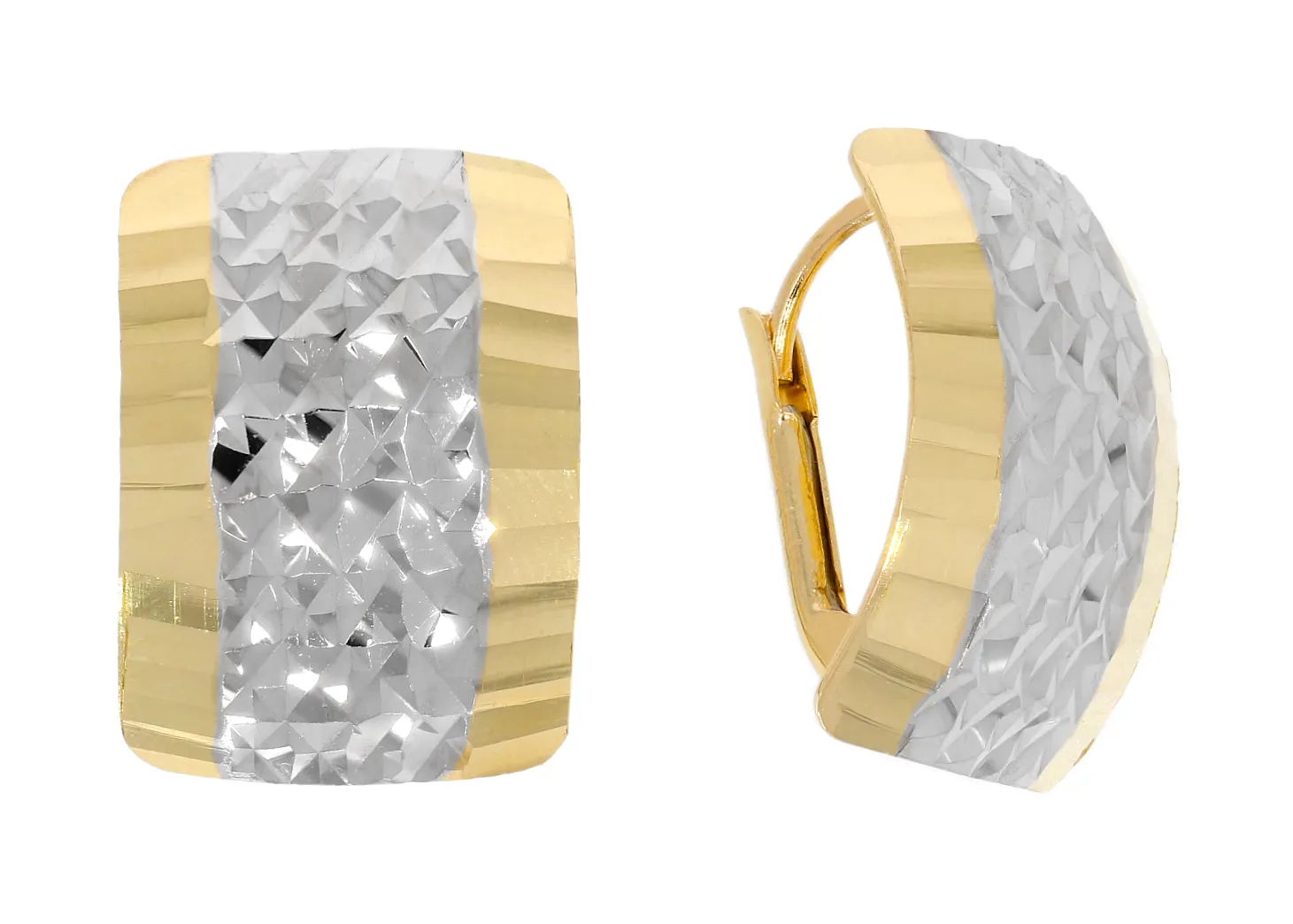 Skutočne krásne, výrazné zlaté náušnice zdobené trblietavým gravírovaným vzorom sú vyrobené zo žltého a bieleho 14 karátového zlata. Náušnice dokonale doladia tak bežný, ako aj slávnostný outfit. Vhodné sú tiež ako darček.